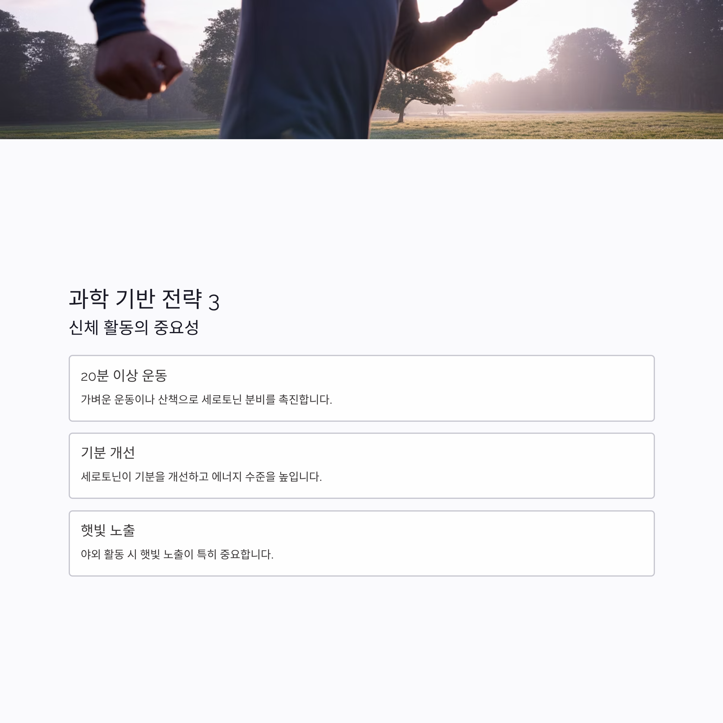 20분 이상의 가벼운 운동이나 산책은 세로토닌 분비를 촉진하여 기분을 개선하고 에너지 수준을 높입니다. 특히 야외 활동 시 햇빛 노출이 중요합니다.