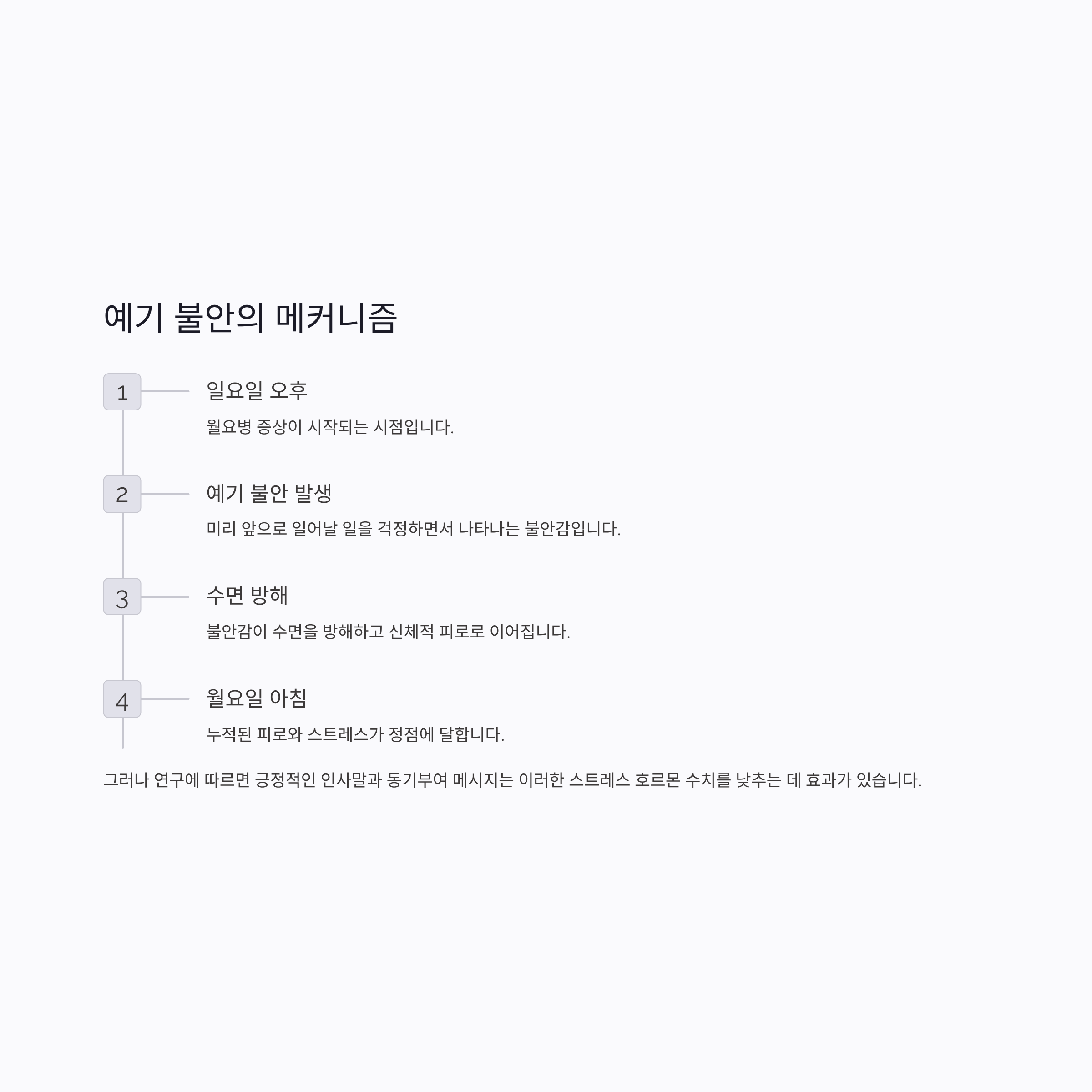이러한 불안감은 수면을 방해하고, 월요일 아침의 신체적 피로로 이어지게 됩니다.