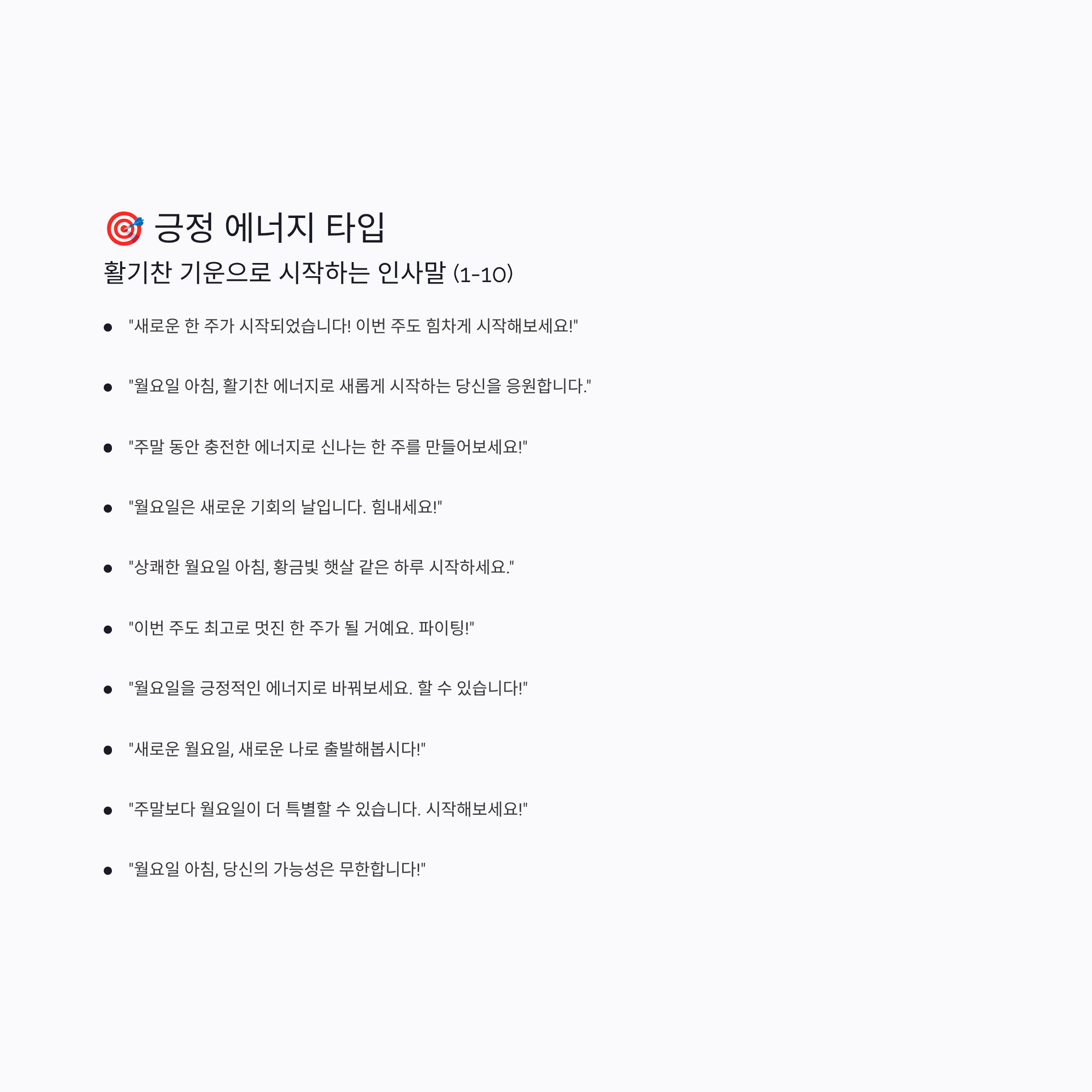 2️⃣ "월요일 아침, 활기찬 에너지로 새롭게 시작하는 당신을 응원합니다."