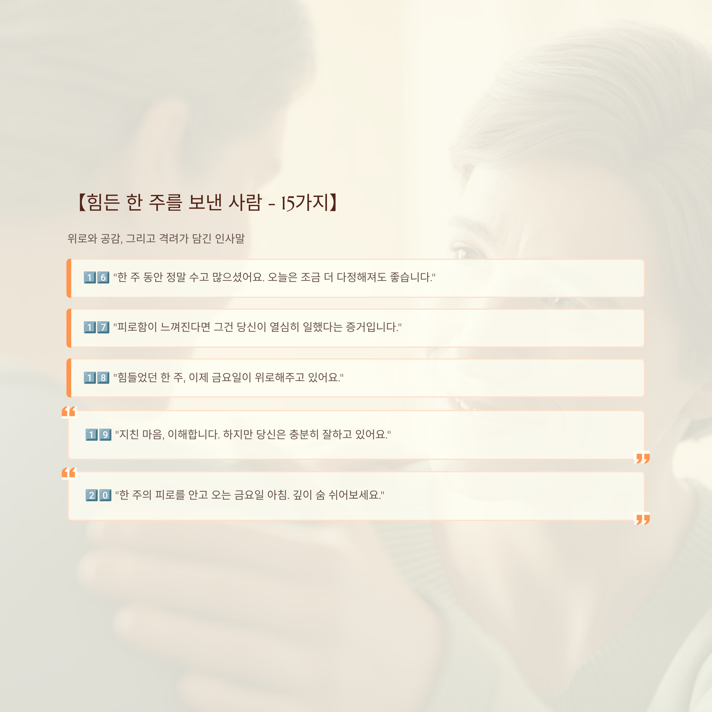 1️⃣6️⃣ "한 주 동안 정말 수고 많으셨어요. 오늘은 조금 더 다정해져도 좋습니다."