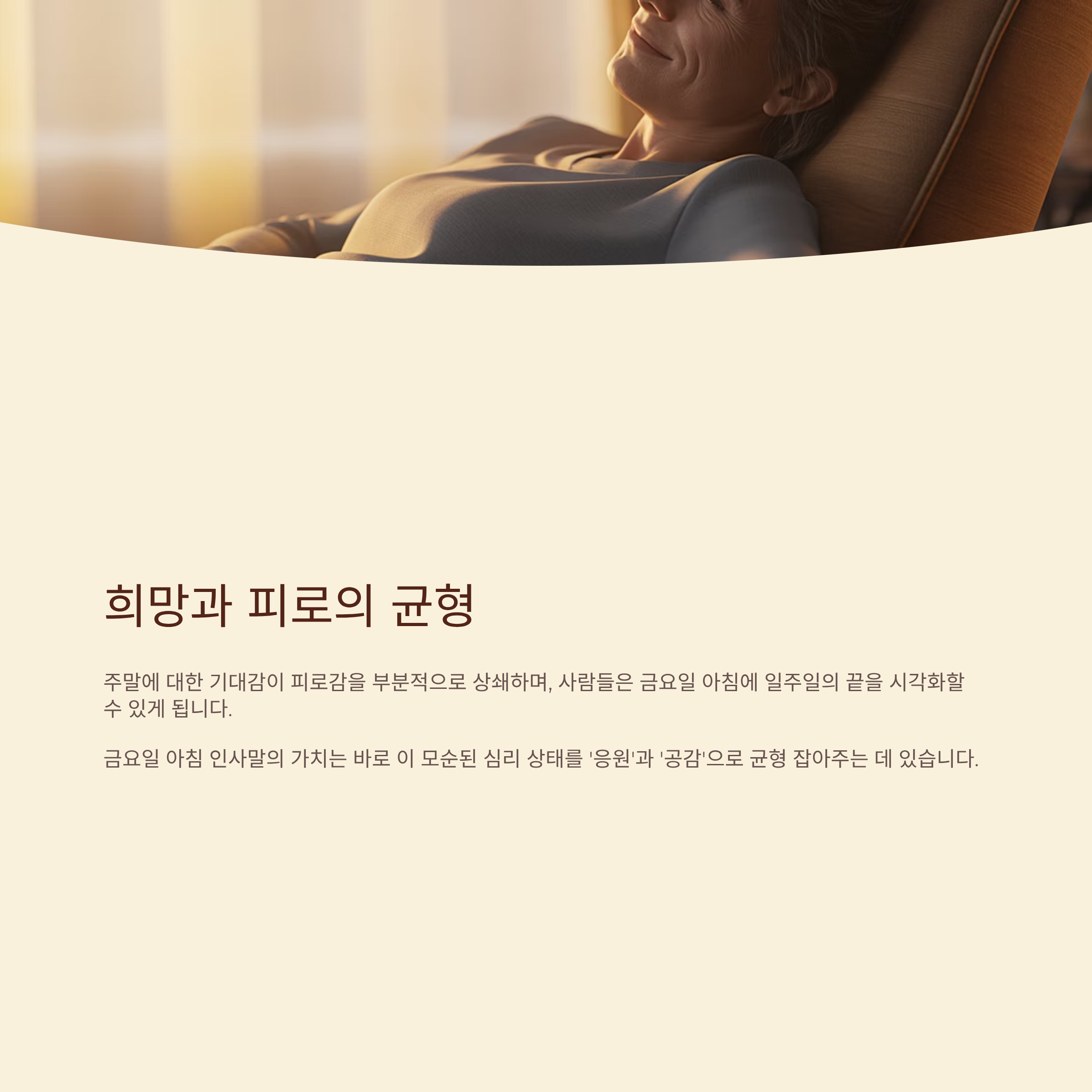 금요일 아침 인사말의 가치는 바로 이 모순된 심리 상태를 '응원'과 '공감'으로 균형 잡아주는 데 있습니다.