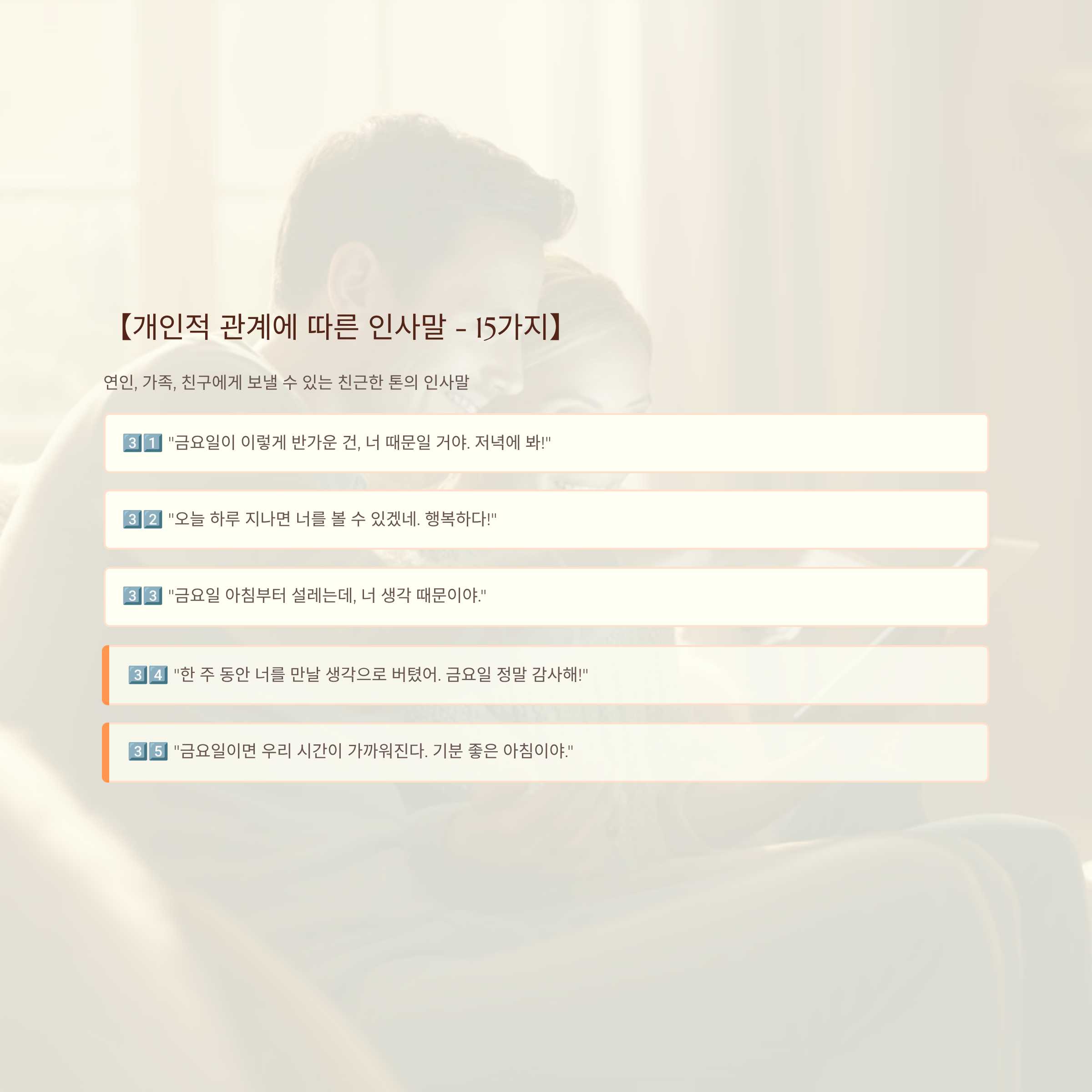 4️⃣3️⃣ "금요일이면 우리 함께하는 시간이 시작돼. 기분 좋은 아침이야!"