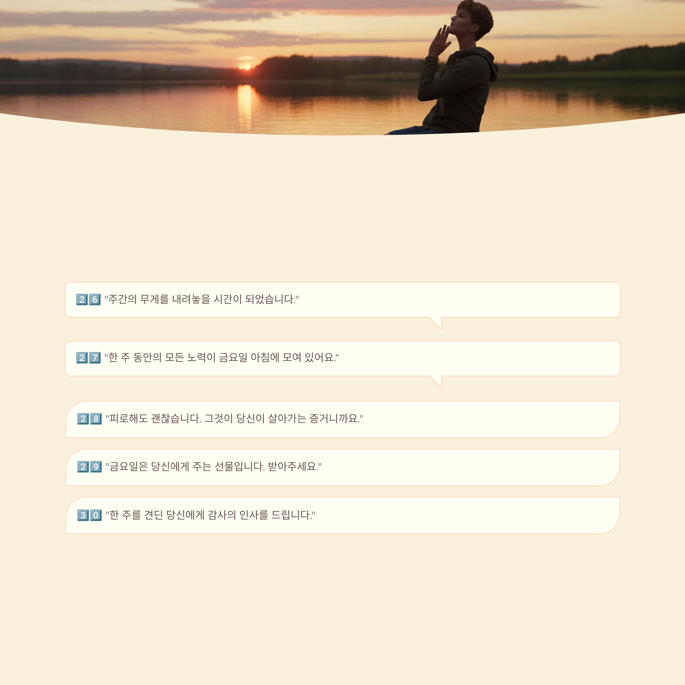 2️⃣0️⃣ "한 주의 피로를 안고 오는 금요일 아침. 깊이 숨 쉬어보세요."