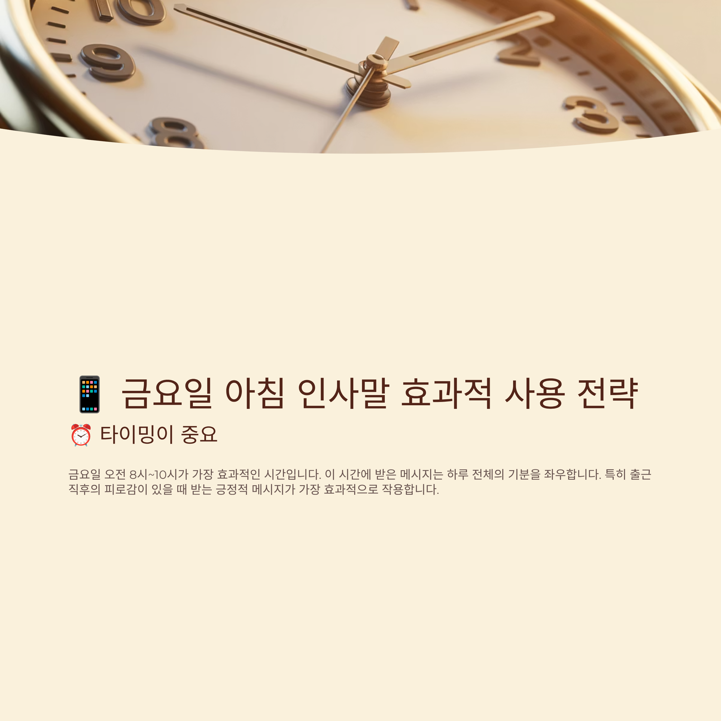 금요일 오전 8시~10시가 가장 효과적인 시간입니다. 이 시간에 받은 메시지는 하루 전체의 기분을 좌우합니다. 특히 출근 직후의 피로감이 있을 때 받는 긍정적 메시지가 가장 효과적으로 작용합니다.