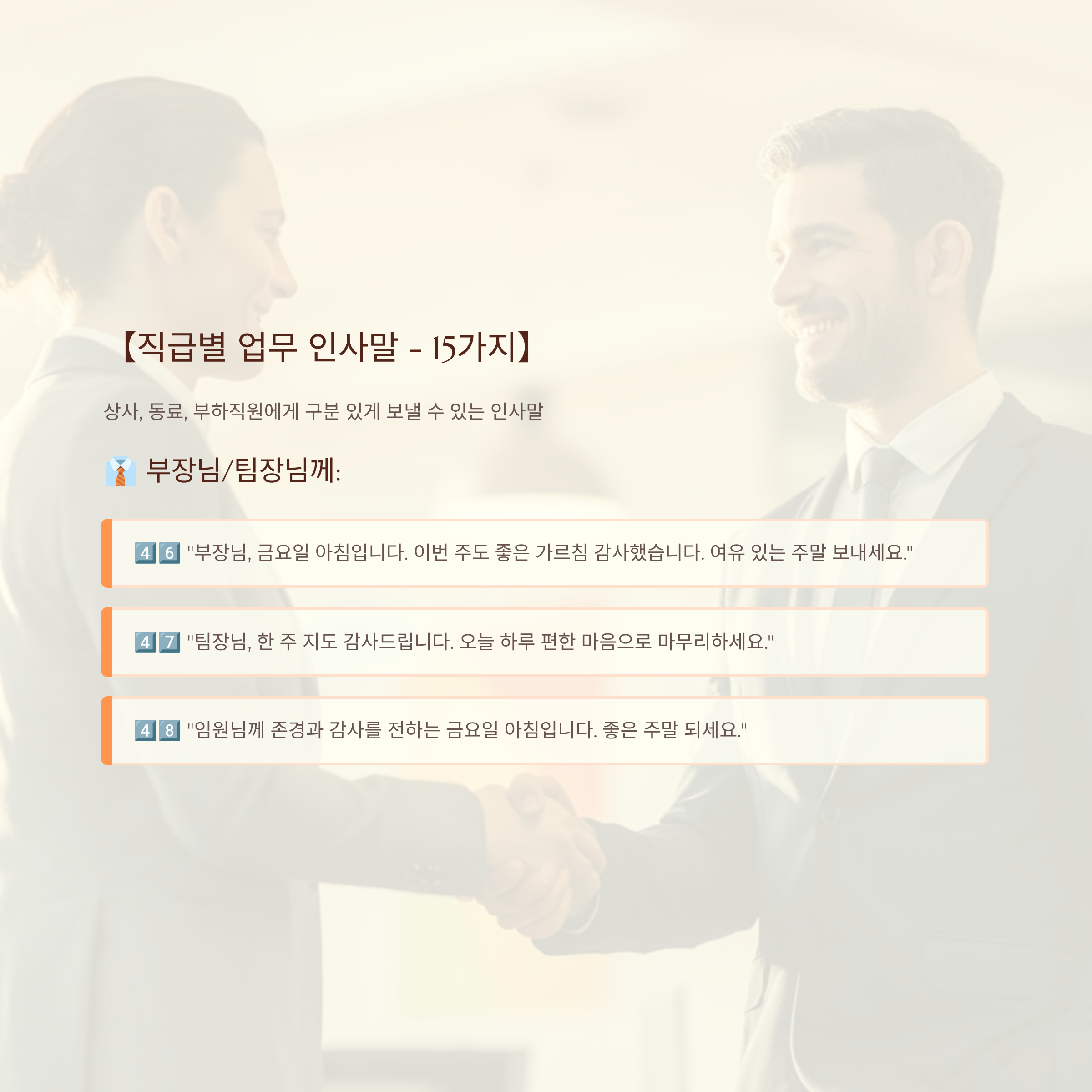 4️⃣8️⃣ "임원님께 존경과 감사를 전하는 금요일 아침입니다. 좋은 주말 되세요."