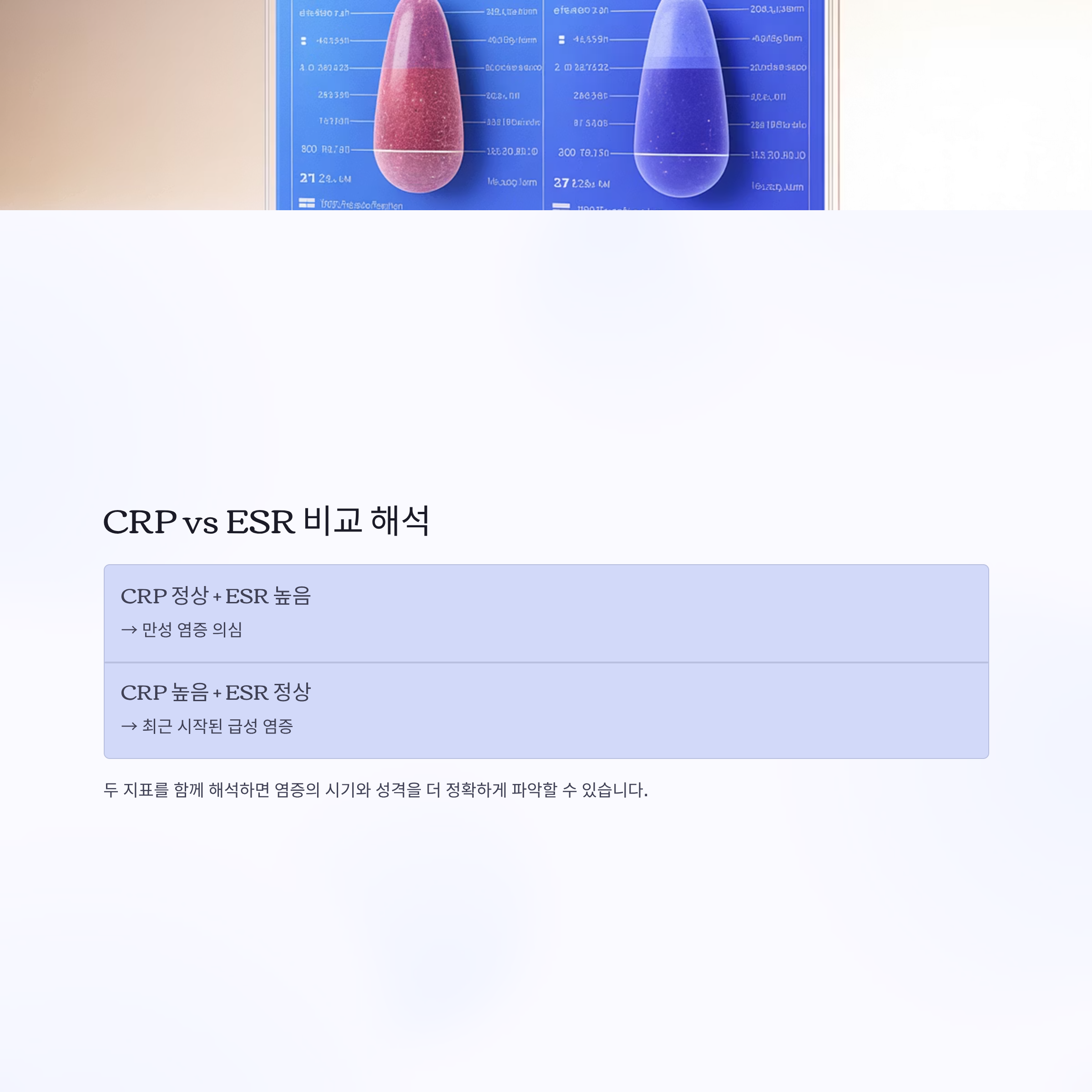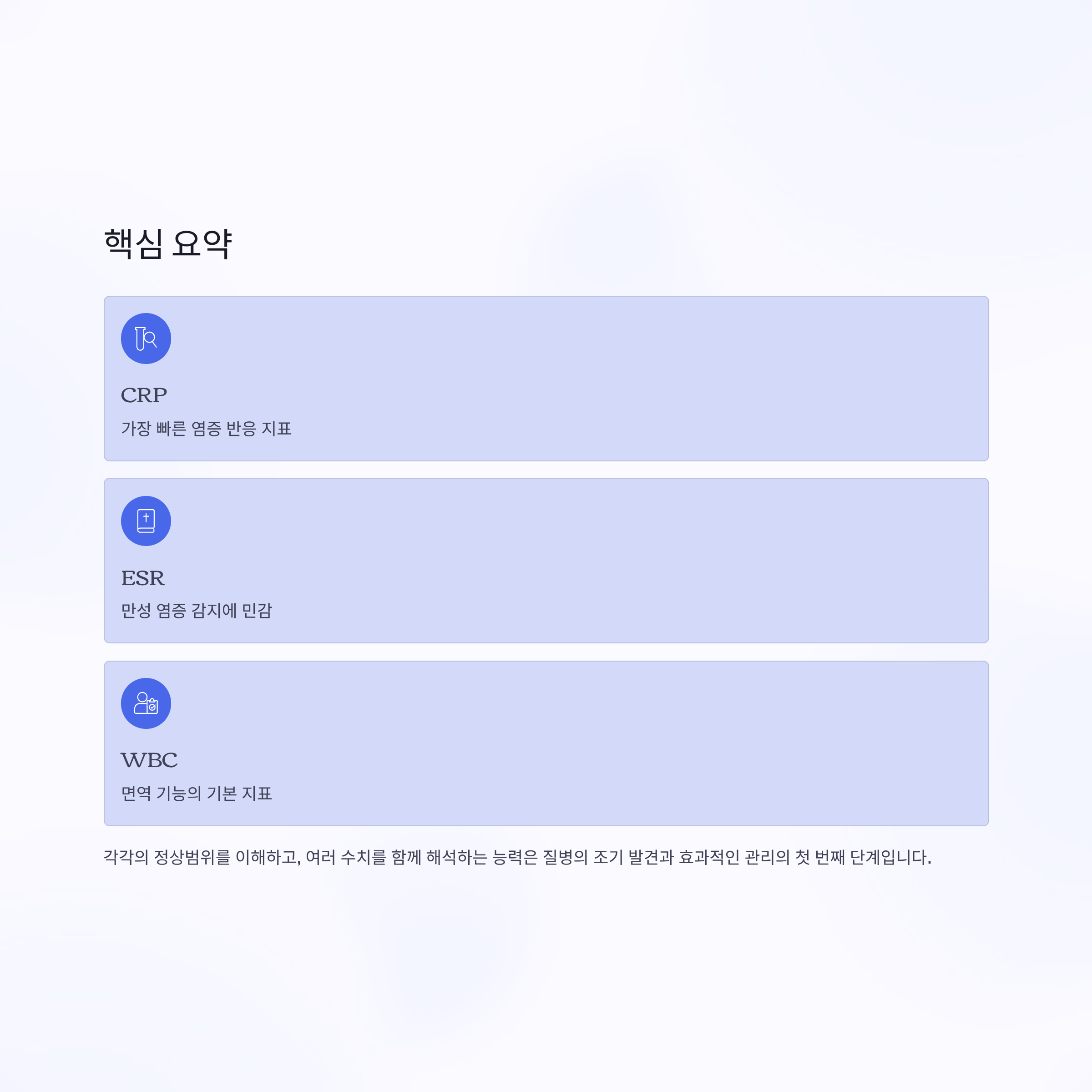 예를 들어 CRP가 높고 WBC도 높으면 현재 급성 감염 상태이며, CRP는 정상인데 ESR이 높으면 만성 염증을 의심할 수 있습니다.