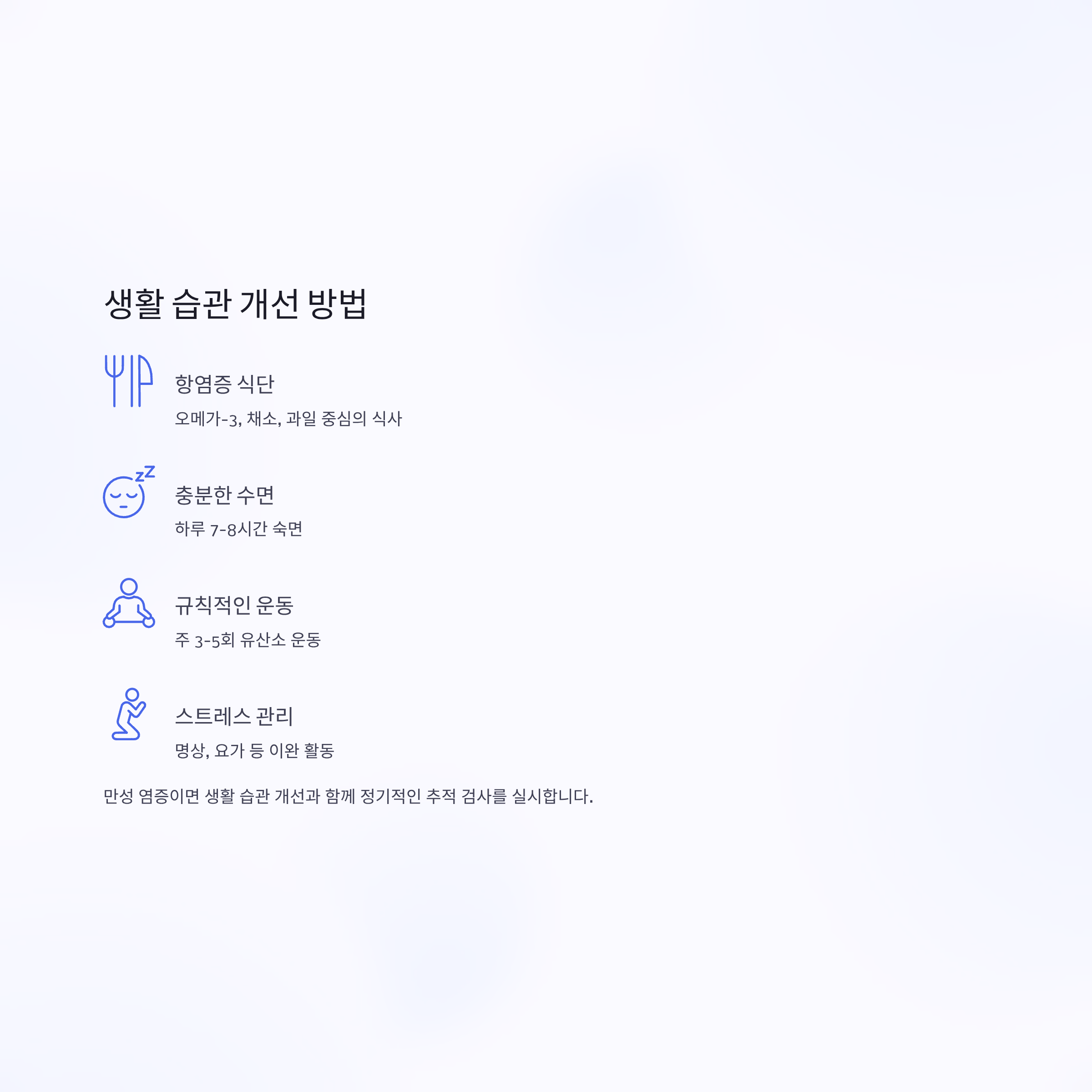 동시에 항염증 식단 실천, 충분한 수면, 규칙적인 운동, 스트레스 관리는 기본이 되어야 합니다.