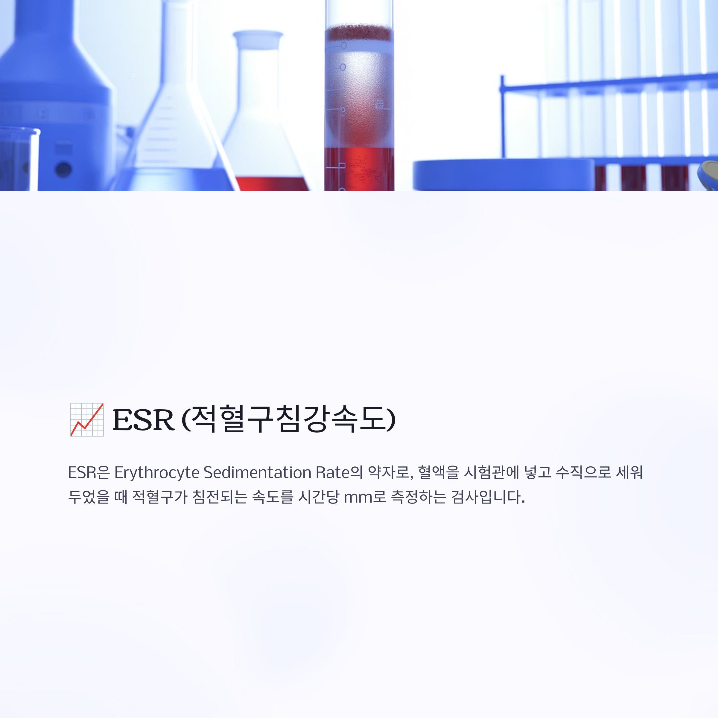 ESR은 Erythrocyte Sedimentation Rate의 약자로, 혈액을 시험관에 넣고 수직으로 세워두었을 때 적혈구가 침전되는 속도를 시간당 mm로 측정하는 검사입니다.