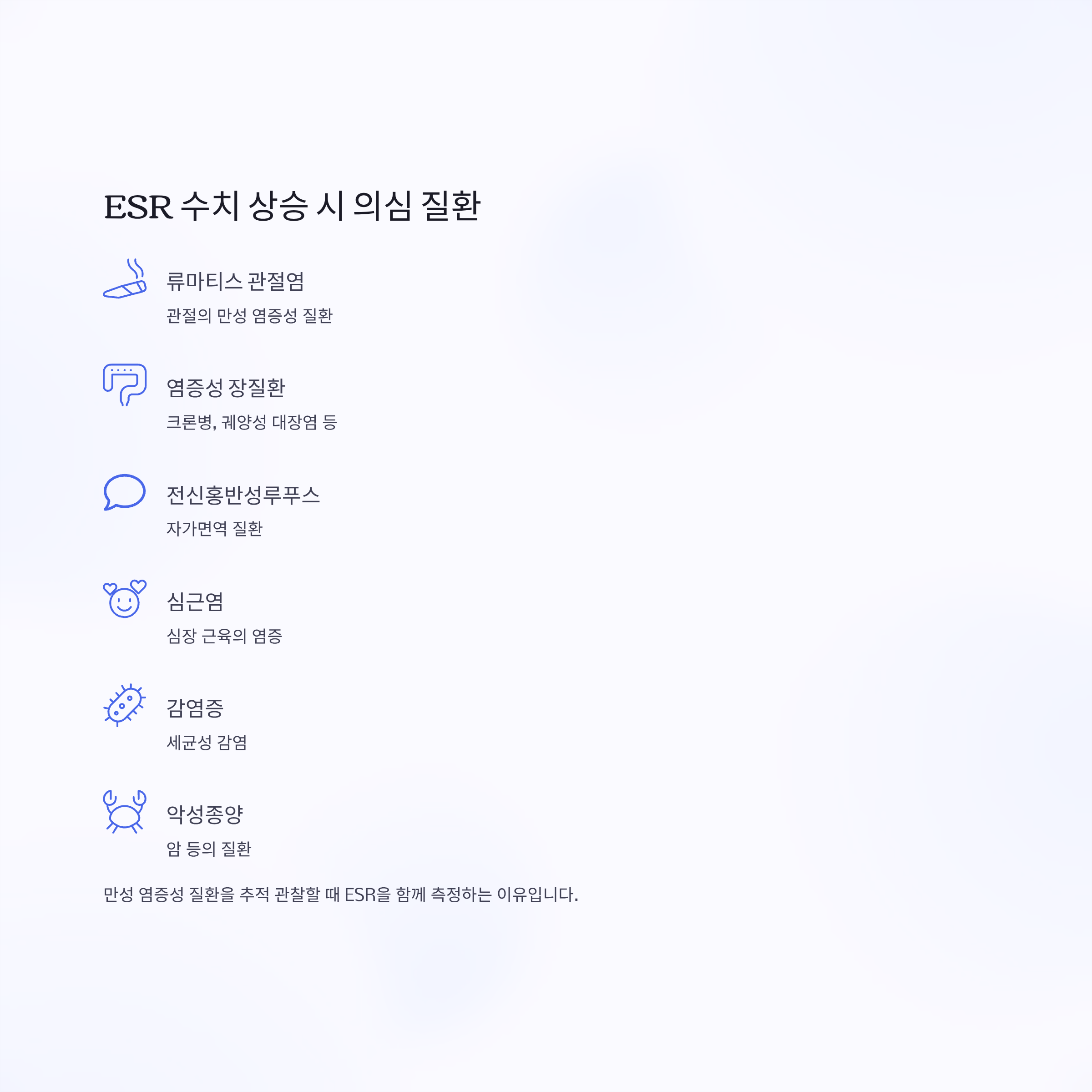 만성 염증성 질환을 추적 관찰할 때 ESR을 함께 측정하는 이유도 이 때문입니다.
