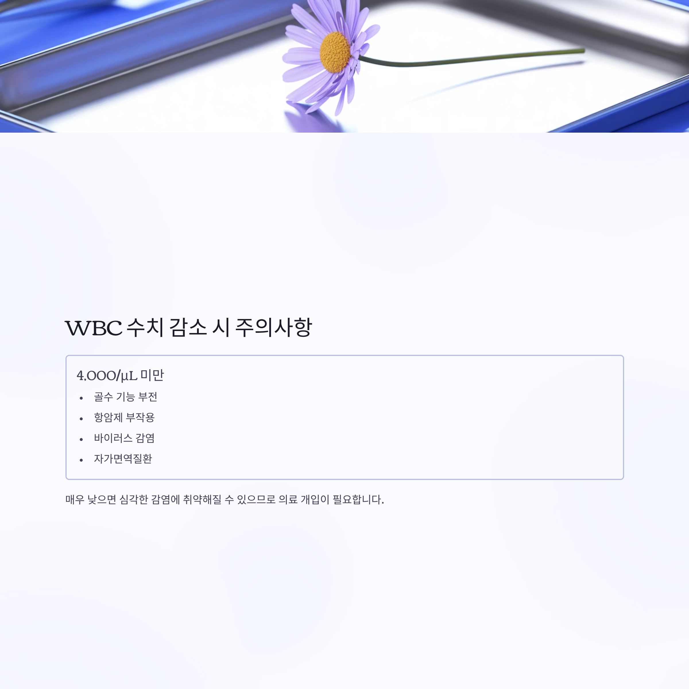 반대로 4,000/μL 미만이면 골수 기능 부전, 항암제 부작용, 바이러스 감염, 자가면역질환을 의심할 수 있습니다.