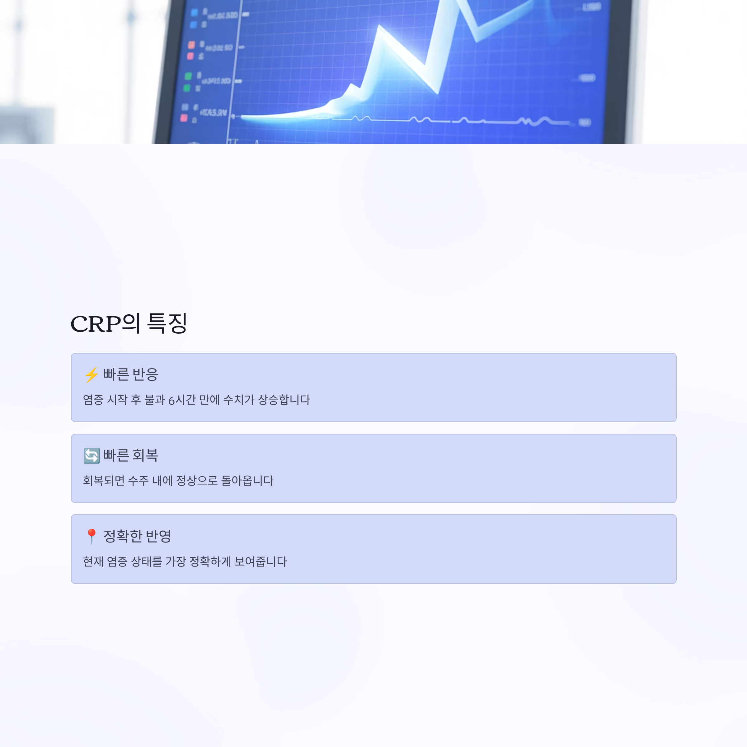 염증이 시작된 지 불과 6시간 후에도 수치가 올라가며, 반대로 회복되면 수주 내에 정상으로 돌아오기 때문에 현재 염증의 상태를 가장 정확하게 반영합니다.