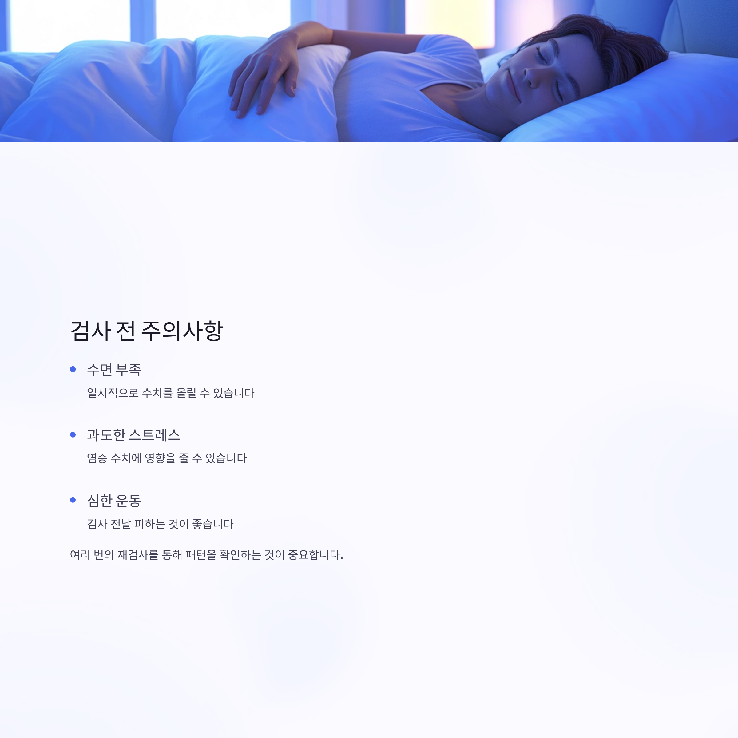 또한 검사 시점 전 수면 부족, 과도한 스트레스, 심한 운동은 일시적으로 수치를 올릴 수 있으므로 여러 번의 재검사를 통해 패턴을 확인하는 것이 중요합니다.