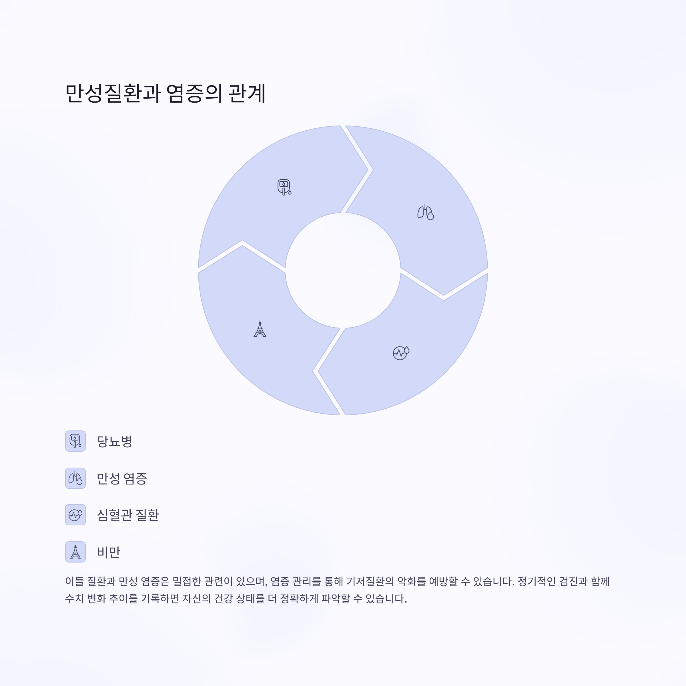 이들 질환과 만성 염증은 밀접한 관련이 있으며, 염증 관리를 통해 기저질환의 악화를 예방할 수 있습니다.