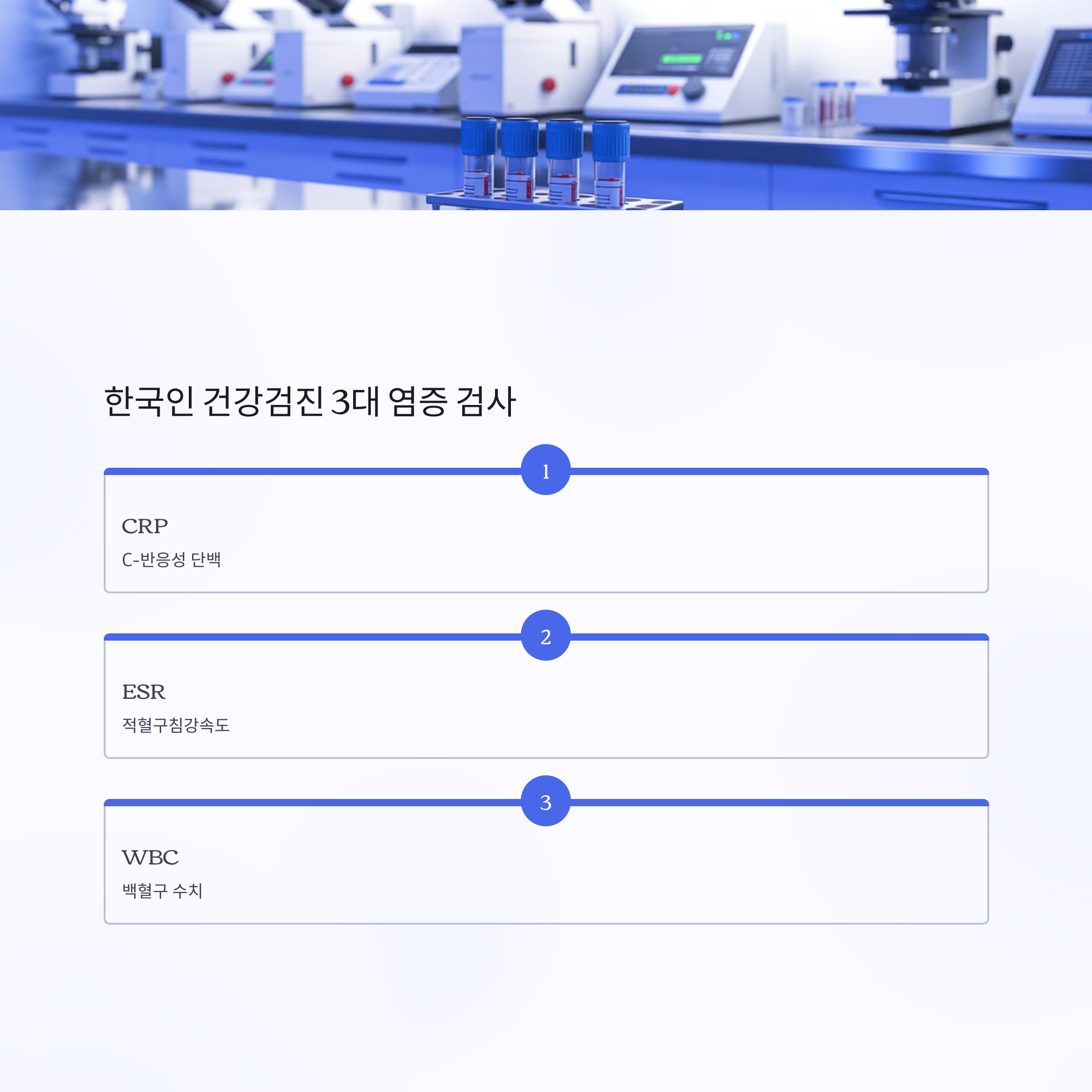 특히 한국인 건강검진에서 가장 많이 실시하는 염증 관련 검사는 CRP, ESR, WBC 세 가지입니다.