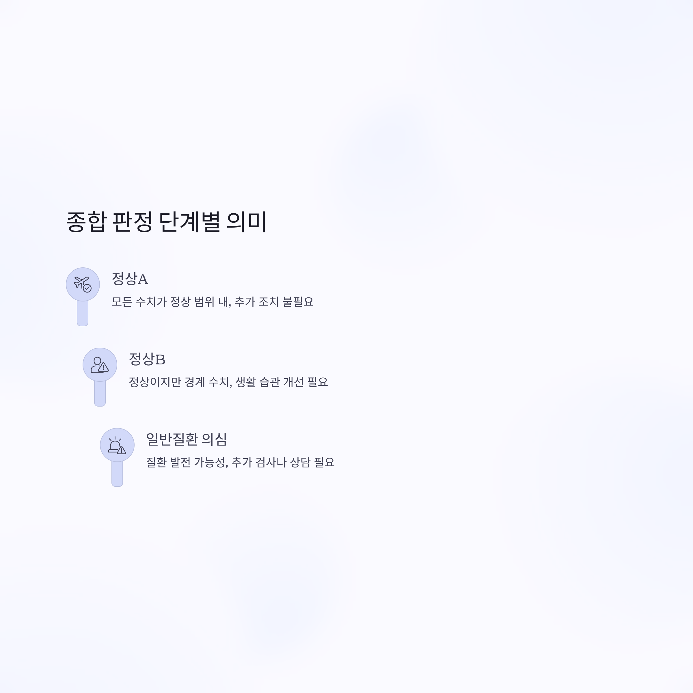 건강검진 결과지의 첫 페이지를 보면 "정상A", "정상B", "일반질환 의심", "질환 의심", "유질환자" 같은 종합 판정이 나옵니다.