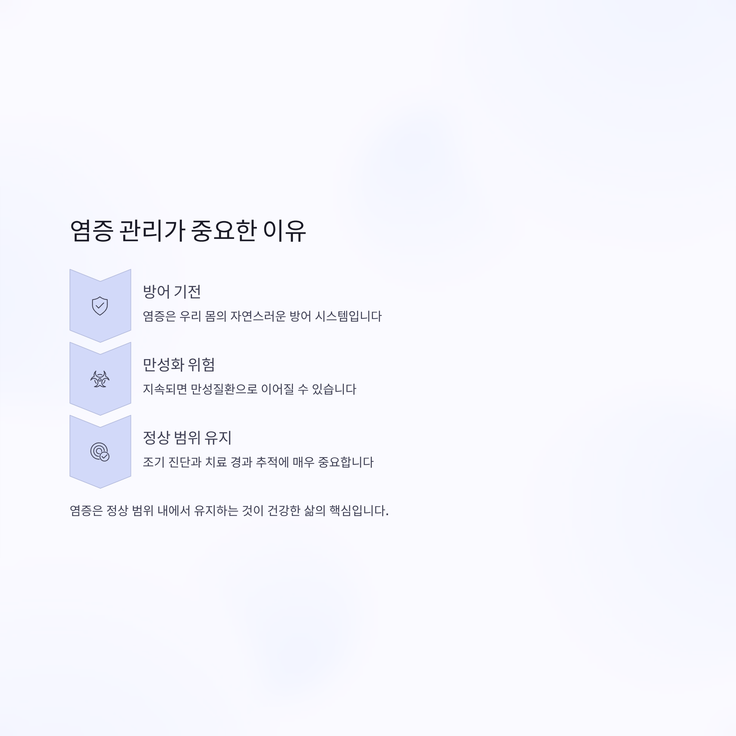 염증은 우리 몸의 방어 기전이지만, 지속되면 만성질환으로 이어질 수 있기 때문에 정상 범위 내에서 유지하는 것이 중요합니다.