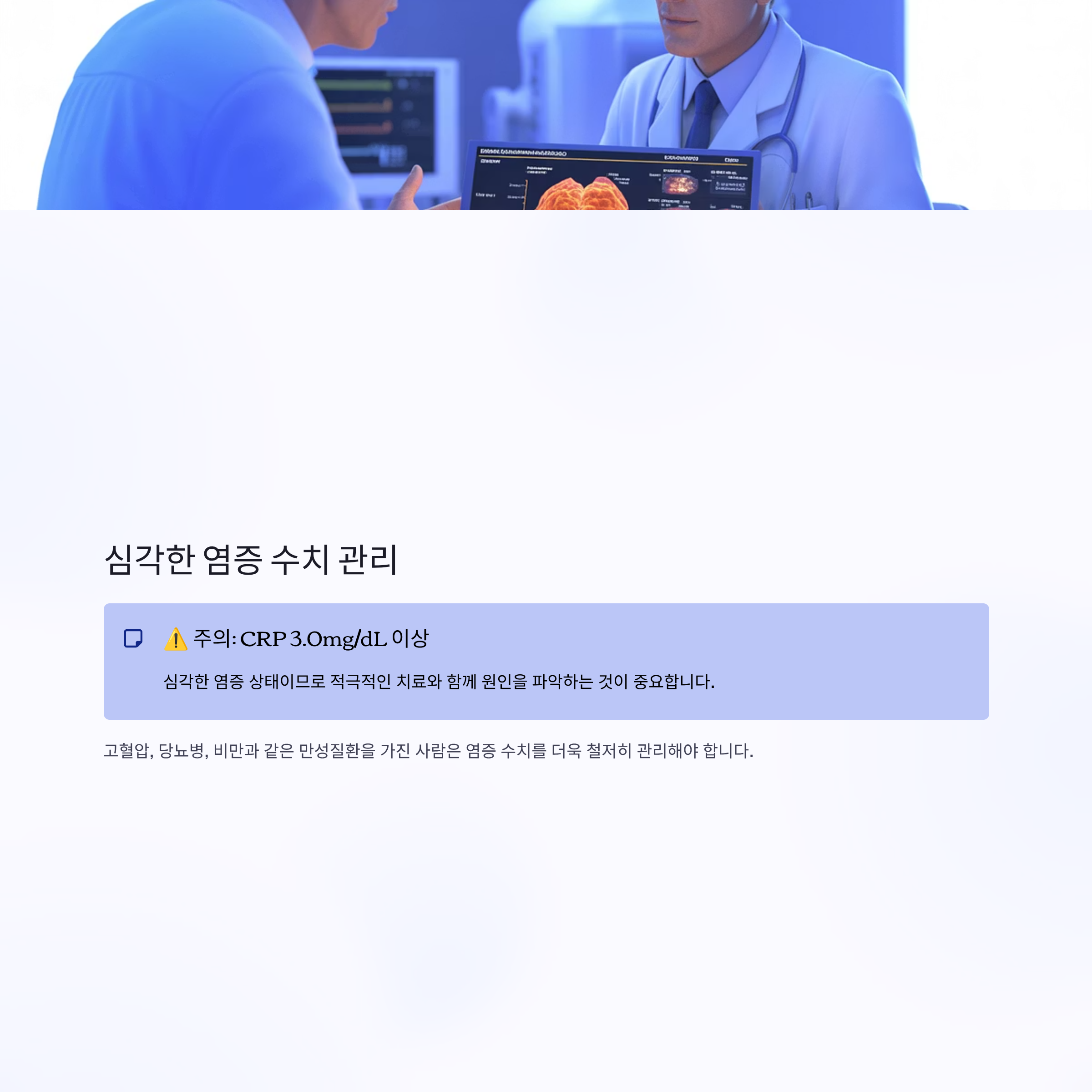 특히 CRP 수치가 3.0mg/dL 이상이면 심각한 염증 상태이므로 적극적인 치료와 함께 원인을 파악하는 것이 중요합니다.