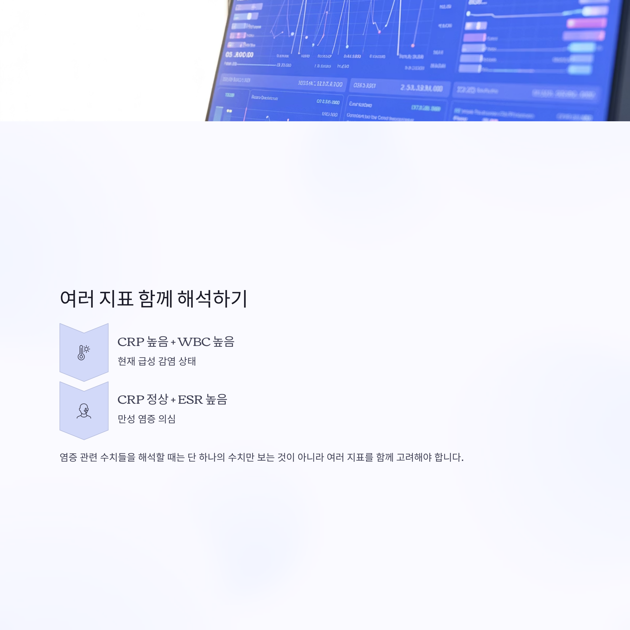 염증 관련 수치들을 해석할 때는 단 하나의 수치만 보는 것이 아니라 여러 지표를 함께 고려해야 합니다.