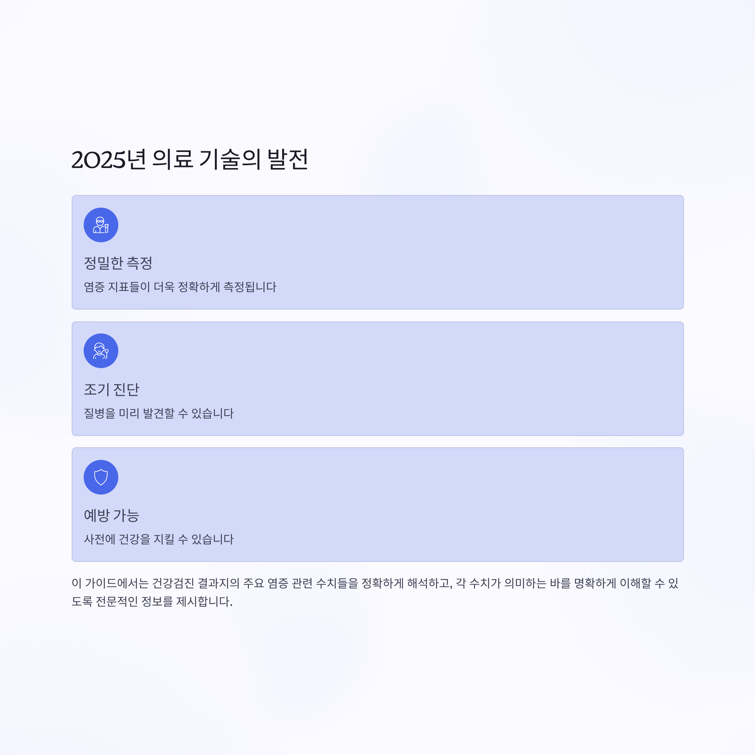 2025년 현재 의료 기술의 발전으로 염증 관련 지표들이 더욱 정밀하게 측정되고 있으며, 조기 진단과 예방이 가능해졌습니다.