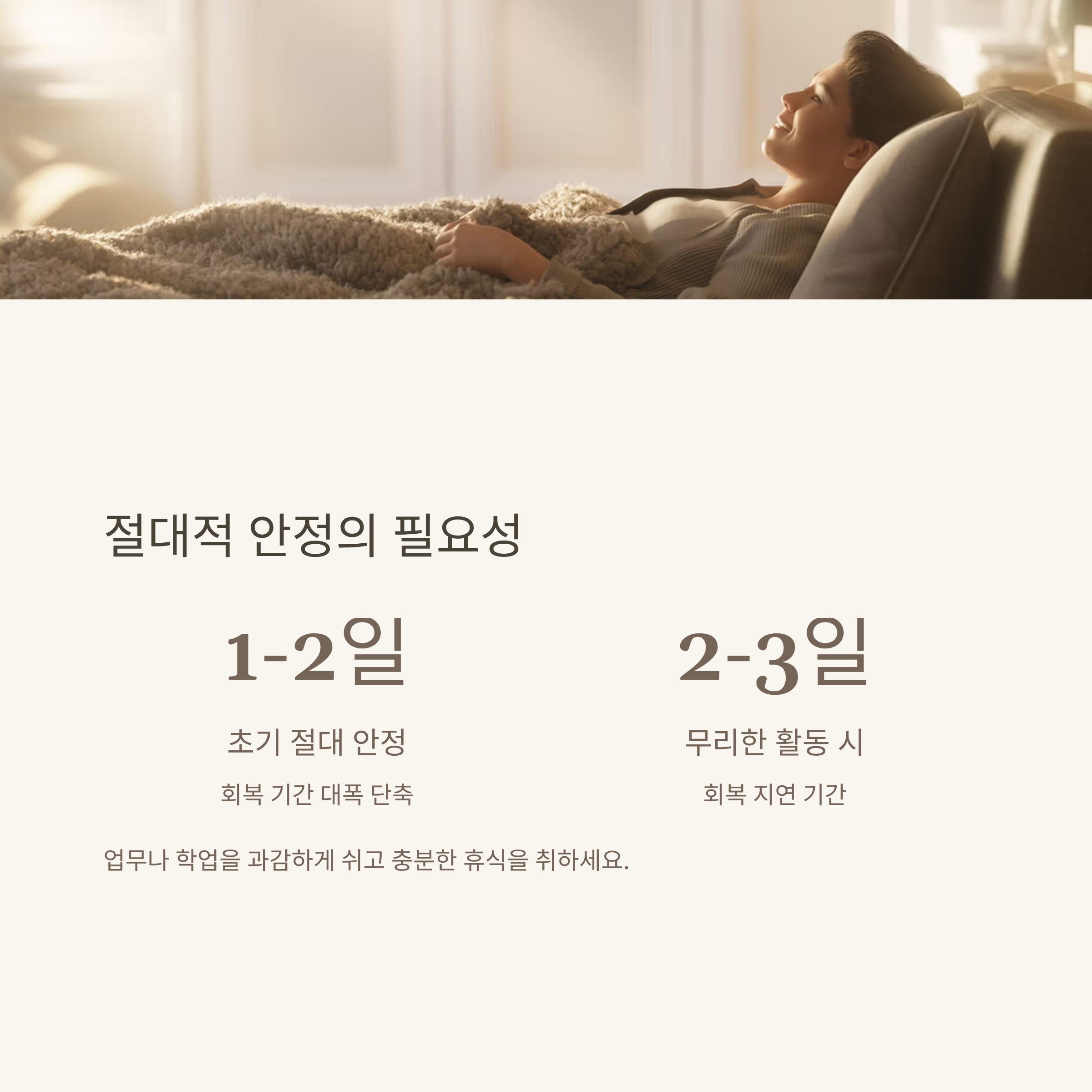 초기 1~2일 동안 절대적인 안정을 취하면 회복 기간이 훨씬 단축되지만, 무리하게 활동을 계속하면 회복이 2~3일 더 지연될 수 있습니다.