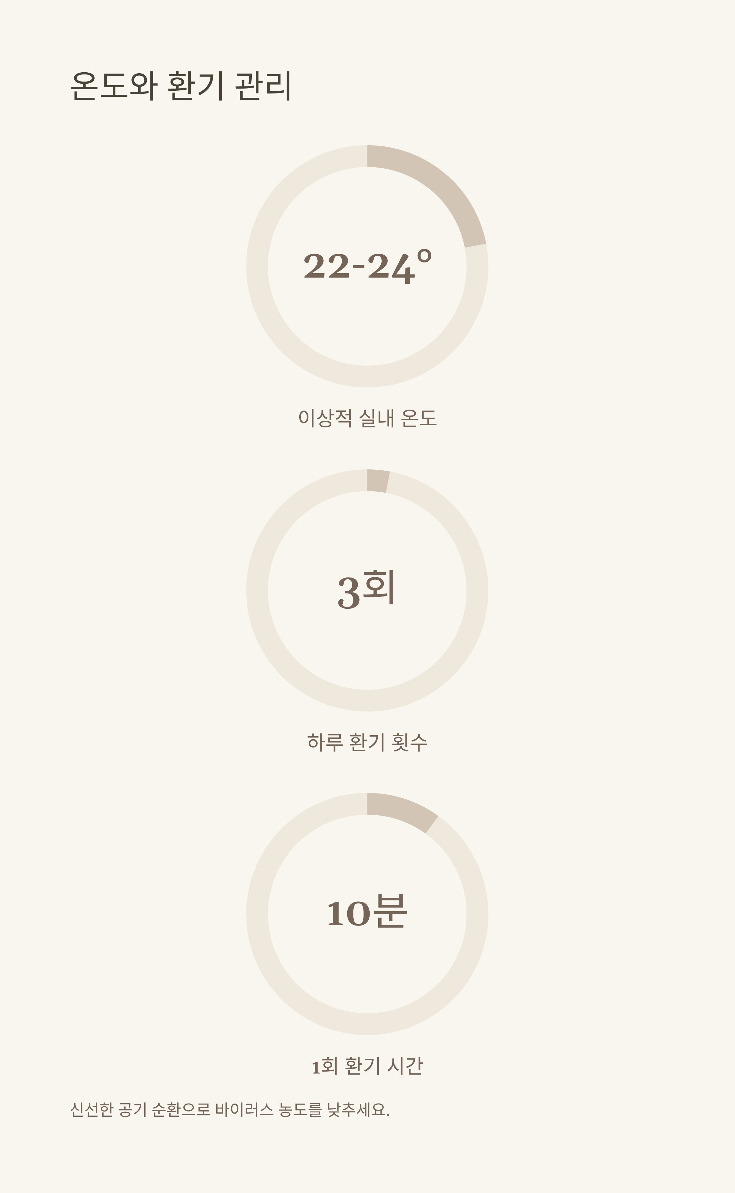 환기도 매우 중요합니다. 하루에 3번 이상, 10분씩 창문을 열어 신선한 공기를 순환시켜야 합니다.