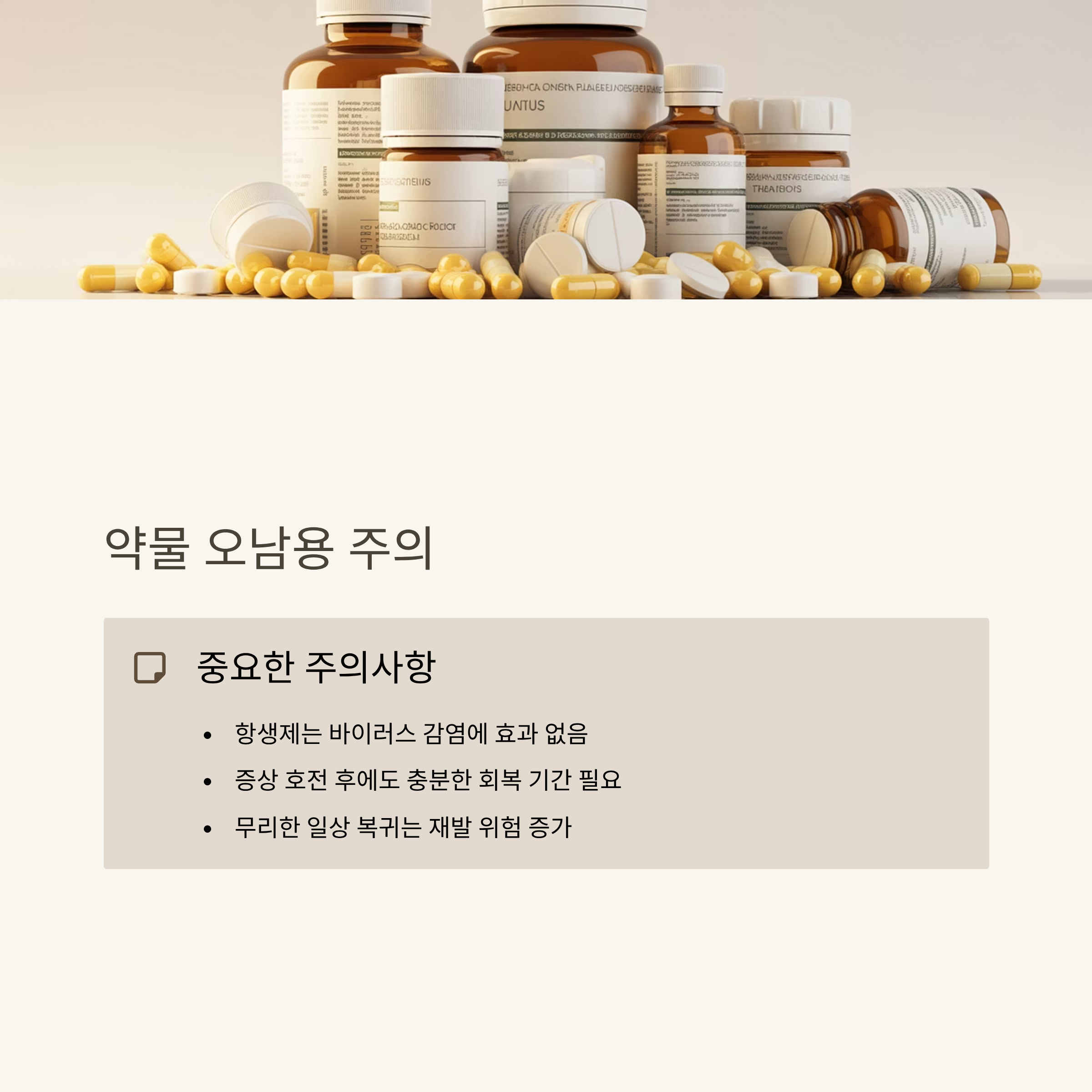 감기는 바이러스 감염이므로 항생제는 효과가 없으며, 오히려 내성만 키울 수 있습니다.