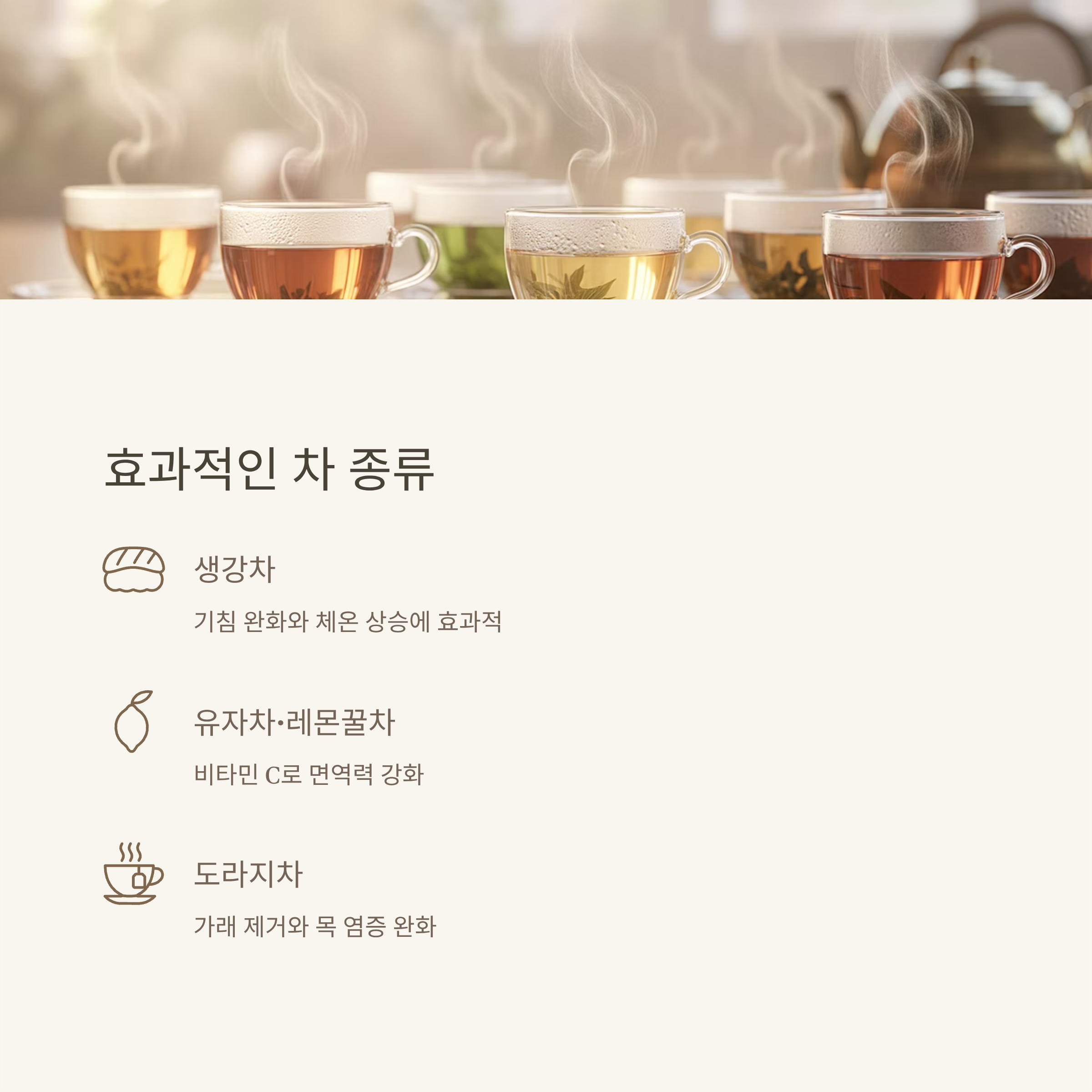 따뜻한 차 종류로는 생강차, 유자차, 레몬꿀차, 도라지차가 특히 효과적입니다.