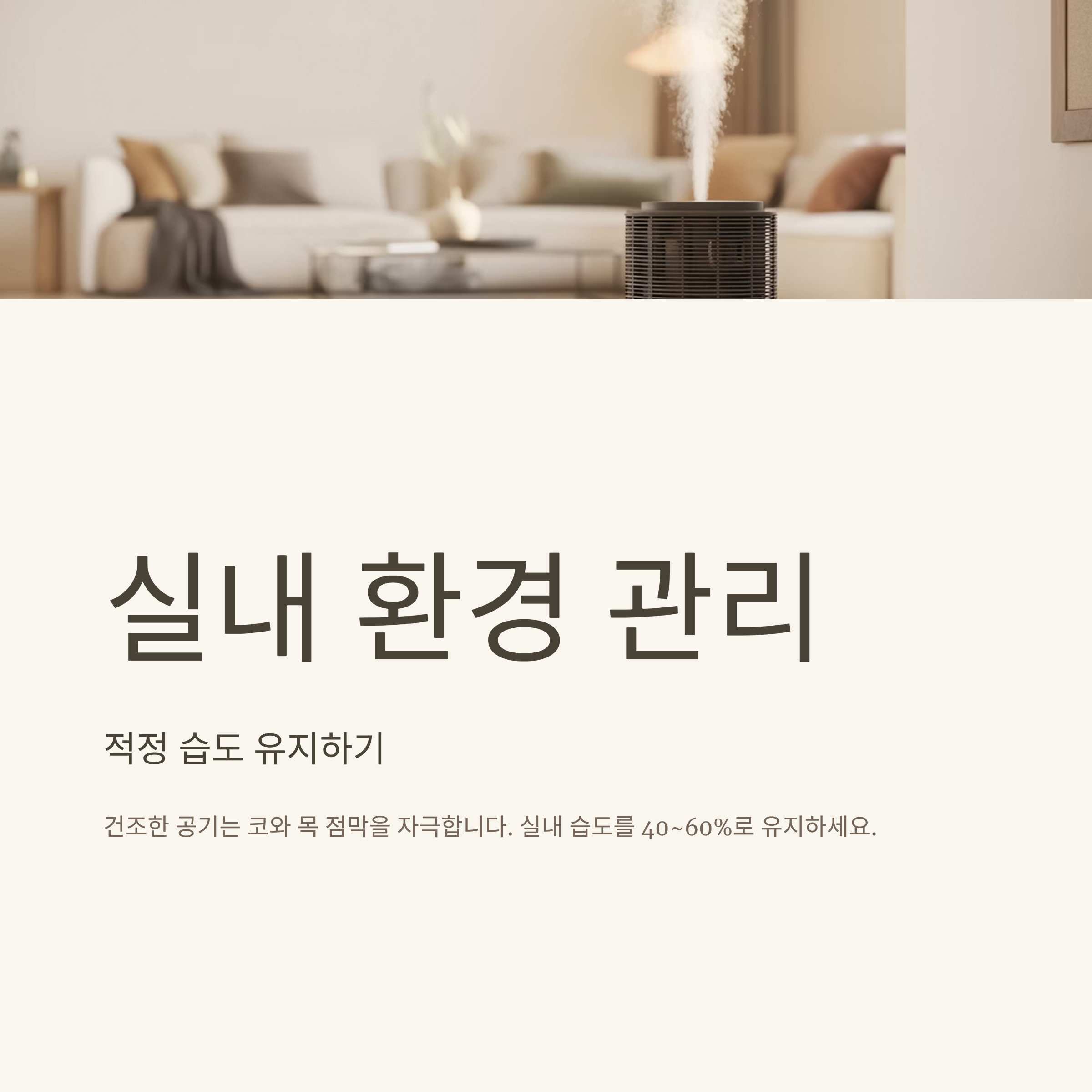 실내 습도를 40~60% 수준으로 유지하면 점막이 촉촉해져 바이러스의 침투를 막고 증상을 완화할 수 있습니다.