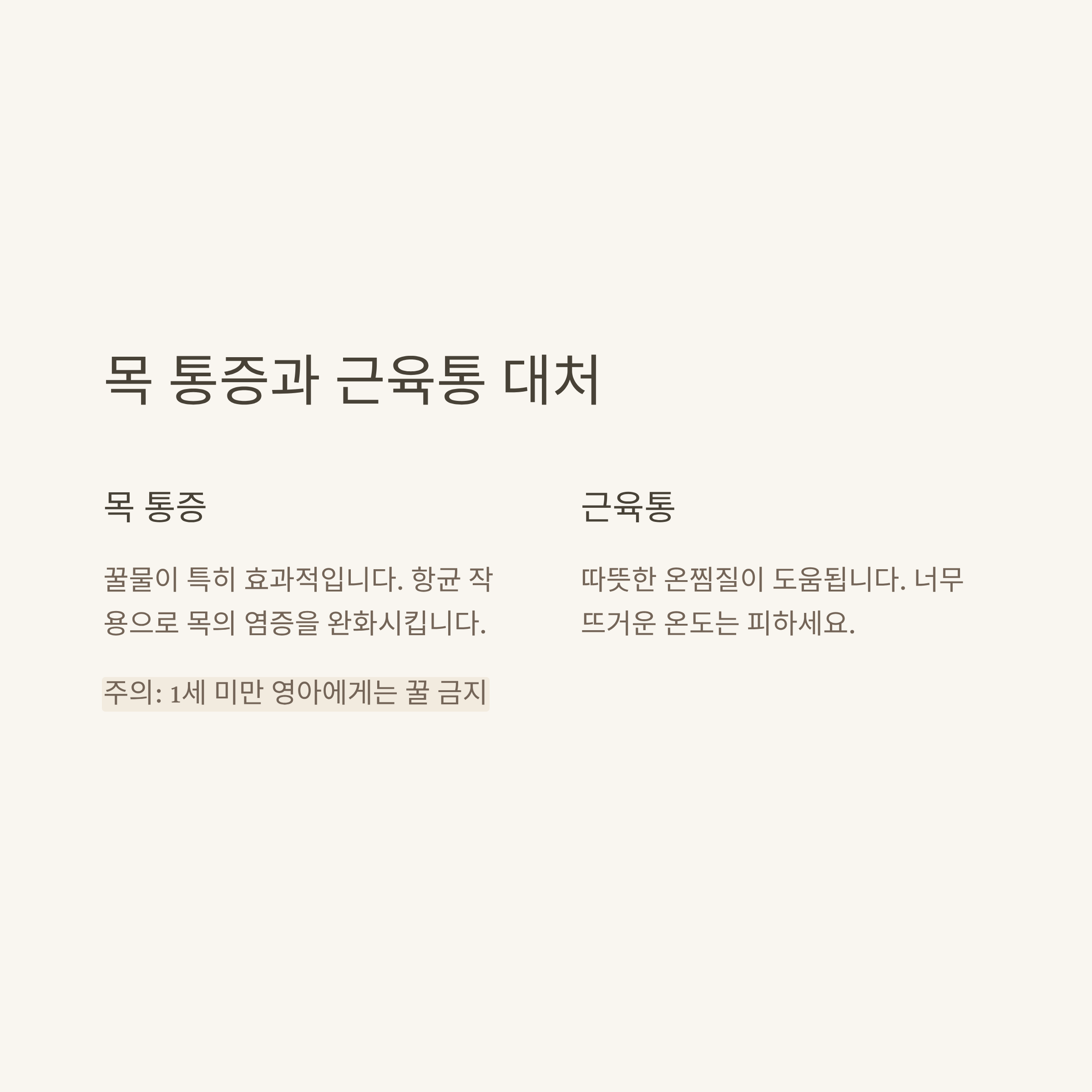 다만 1세 미만 영아에게는 꿀을 주지 않아야 합니다. 근육통이 심할 때는 따뜻한 온찜질이 도움이 되지만, 너무 뜨거운 온도는 피해야 합니다.