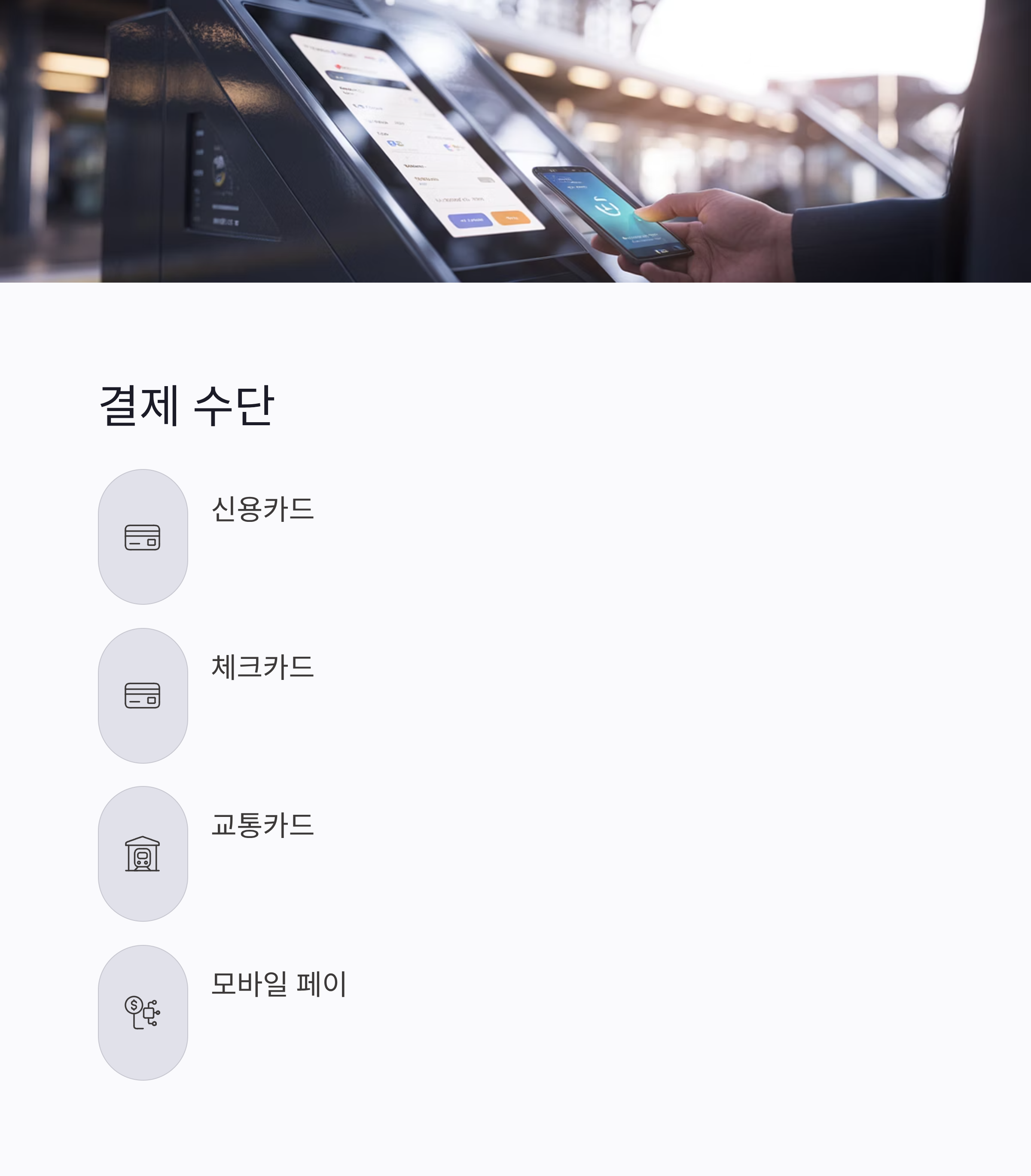 신용카드, 체크카드, 교통카드, 모바일 페이 등 다양한 결제 수단이 가능합니다.