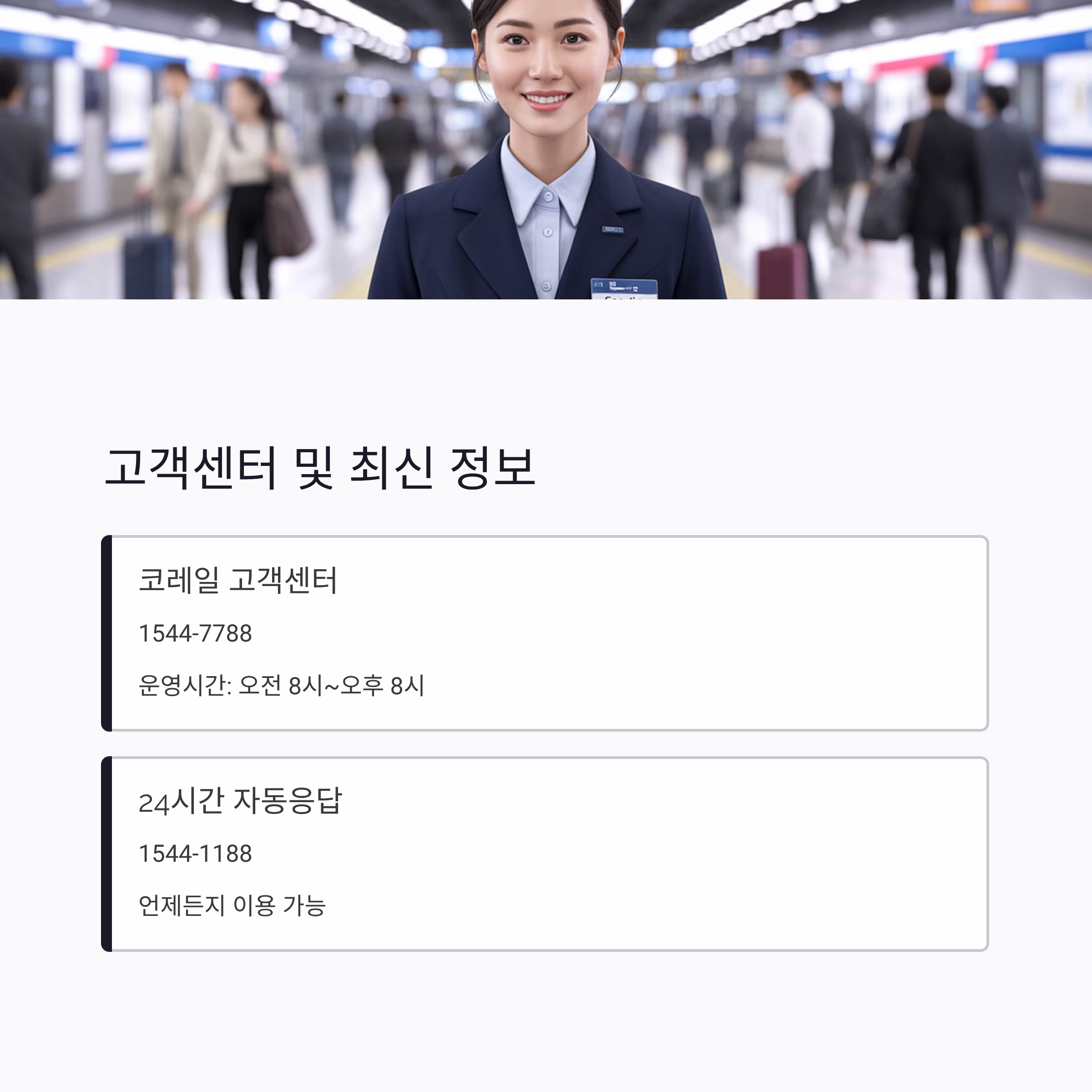 코레일 고객센터는 1544-7788(오전 8시~오후 8시)이며, 24시간 자동응답 번호는 1544-1188입니다.