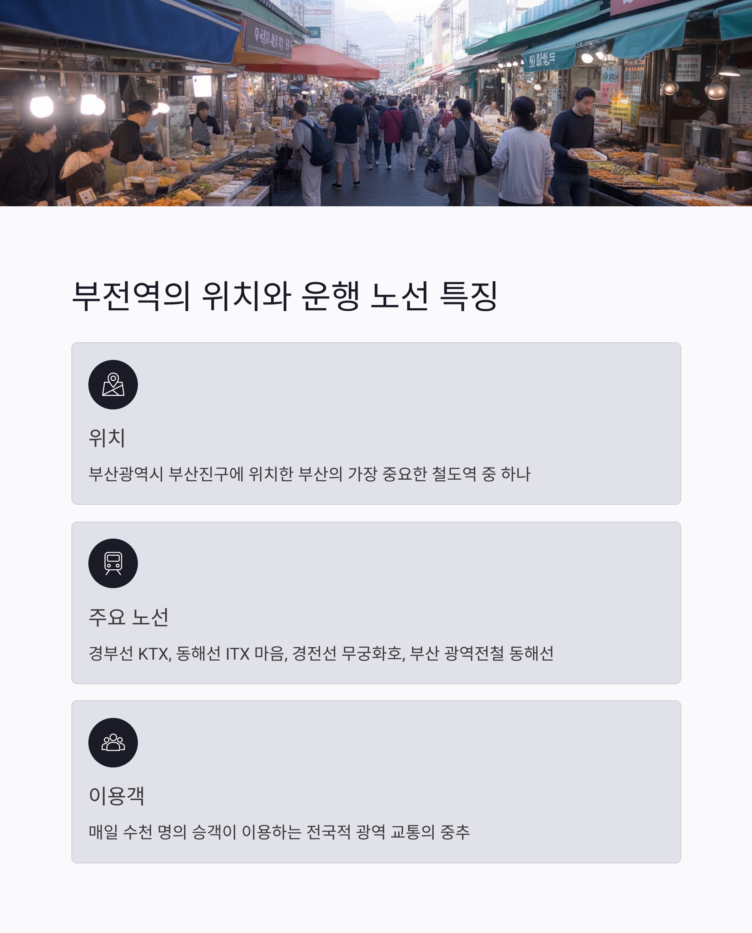 부산의 핵심 철도 교통 허브인 부전역은 서울, 강릉, 목포, 동대구 등 전국 주요 도시로 연결되는 중요한 기차역입니다.