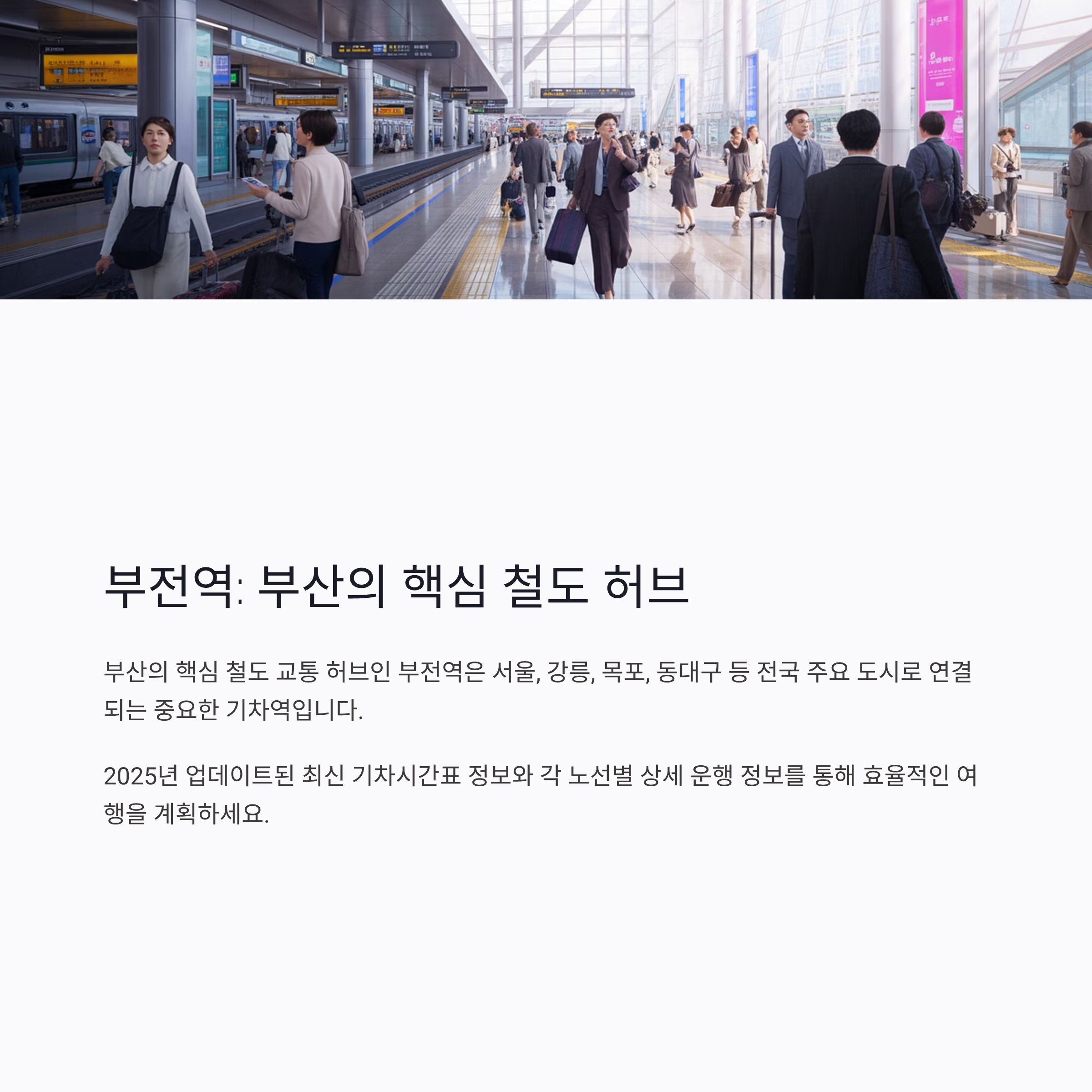 2025년 업데이트된 최신 기차시간표 정보와 각 노선별 상세 운행 정보를 통해 부전역을 이용하는 모든 승객들이 효율적인 여행을 계획할 수 있도록 정보를 정리했습니다.