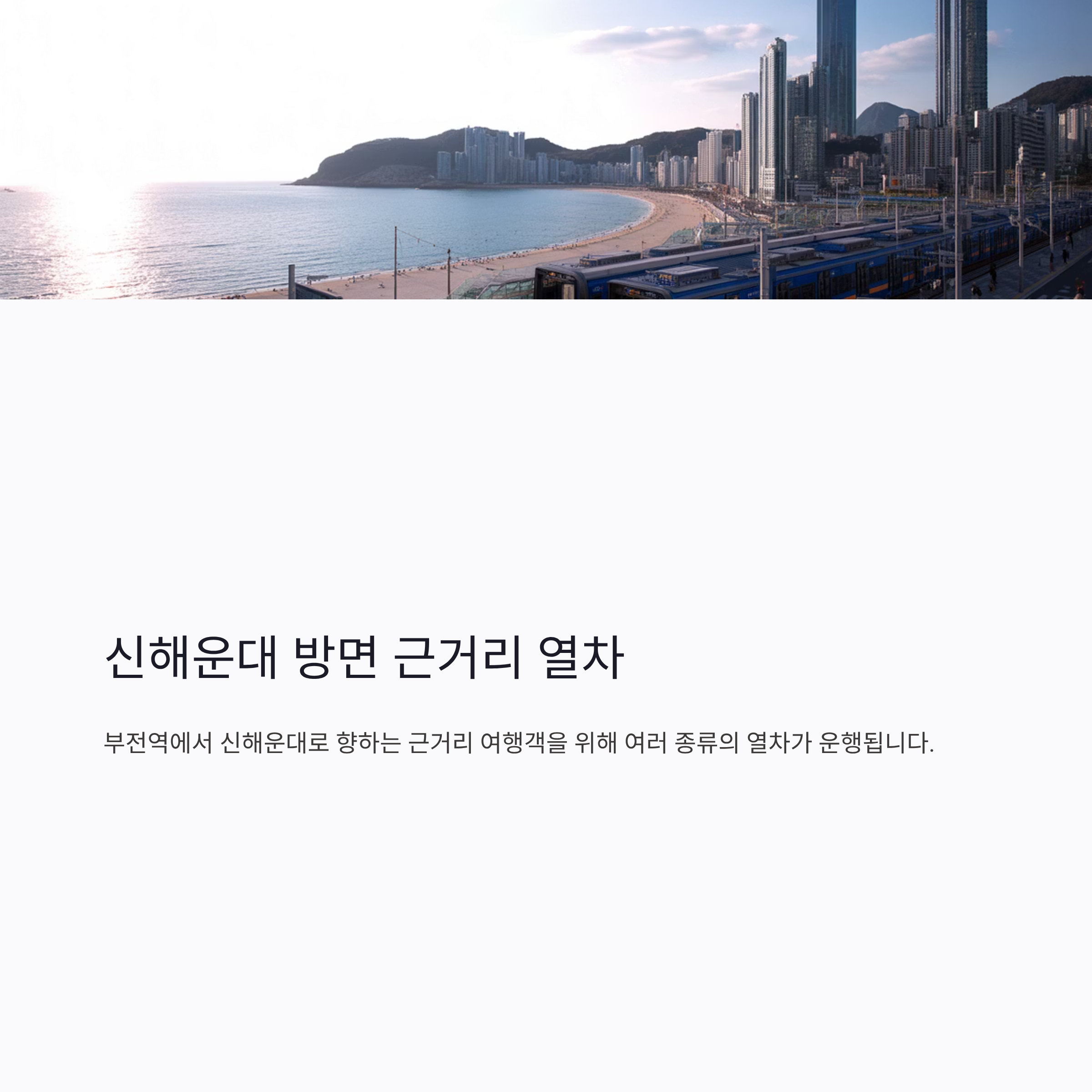 부전역에서 신해운대로 향하는 근거리 여행객을 위해 여러 종류의 열차가 운행됩니다.