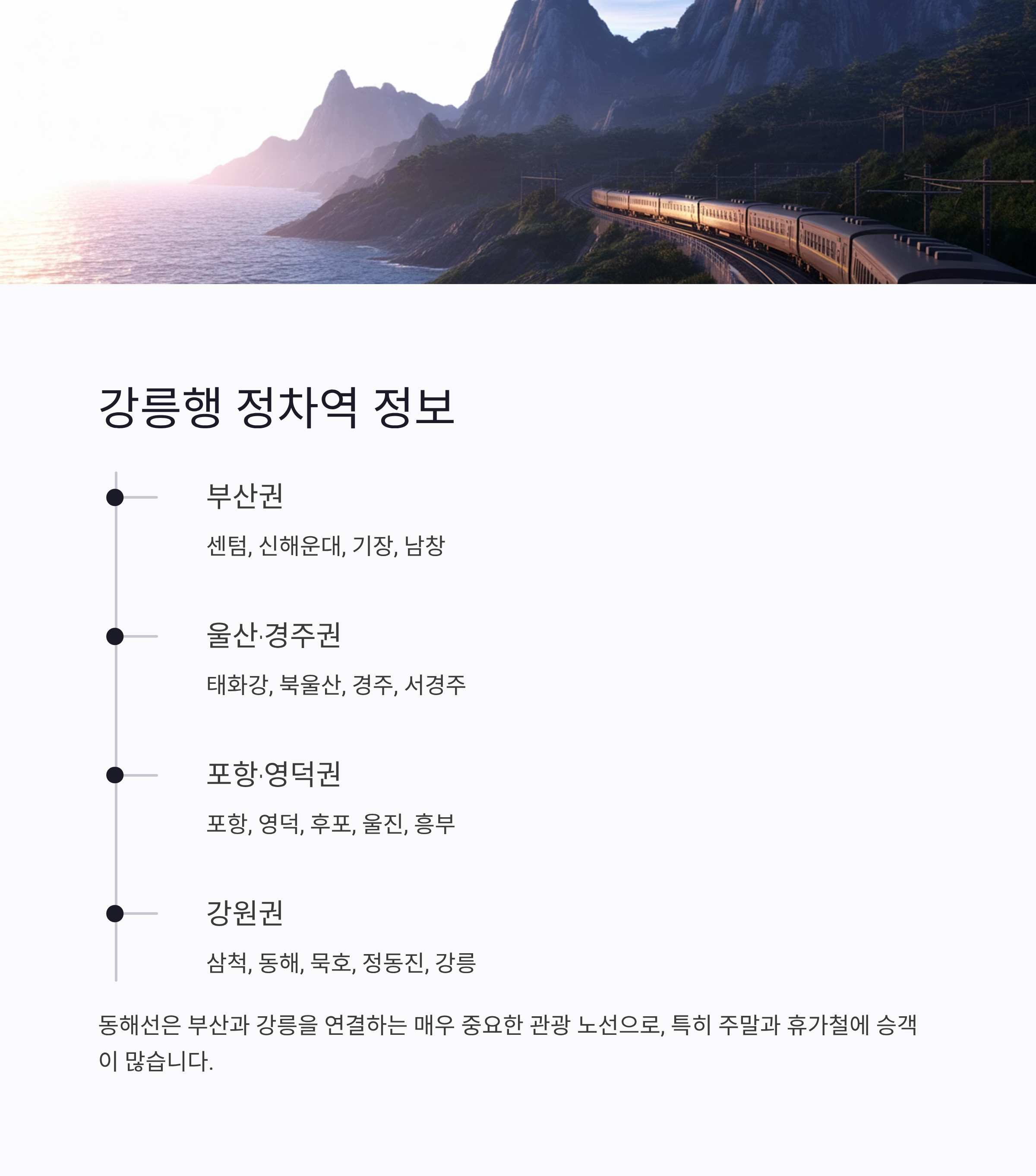 주요 정차역은 센텀, 신해운대, 기장, 남창, 태화강, 북울산, 경주, 서경주, 포항, 영덕, 후포, 울진, 흥부, 삼척, 동해, 묵호, 정동진역을 거쳐 강릉역에 도착합니다.