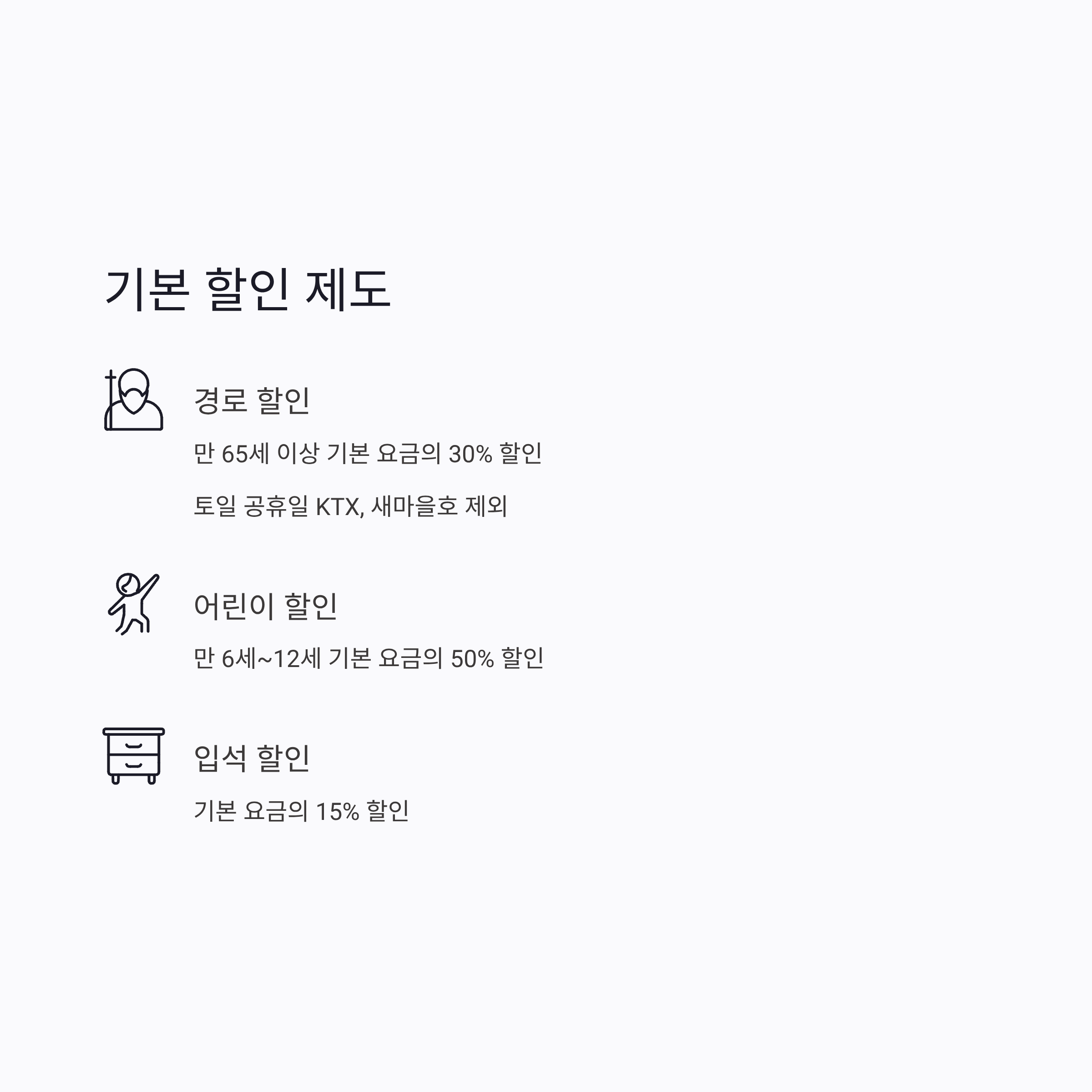 다만, 토요일, 일요일, 공휴일에 KTX나 새마을호를 이용할 경우 할인이 적용되지 않습니다.