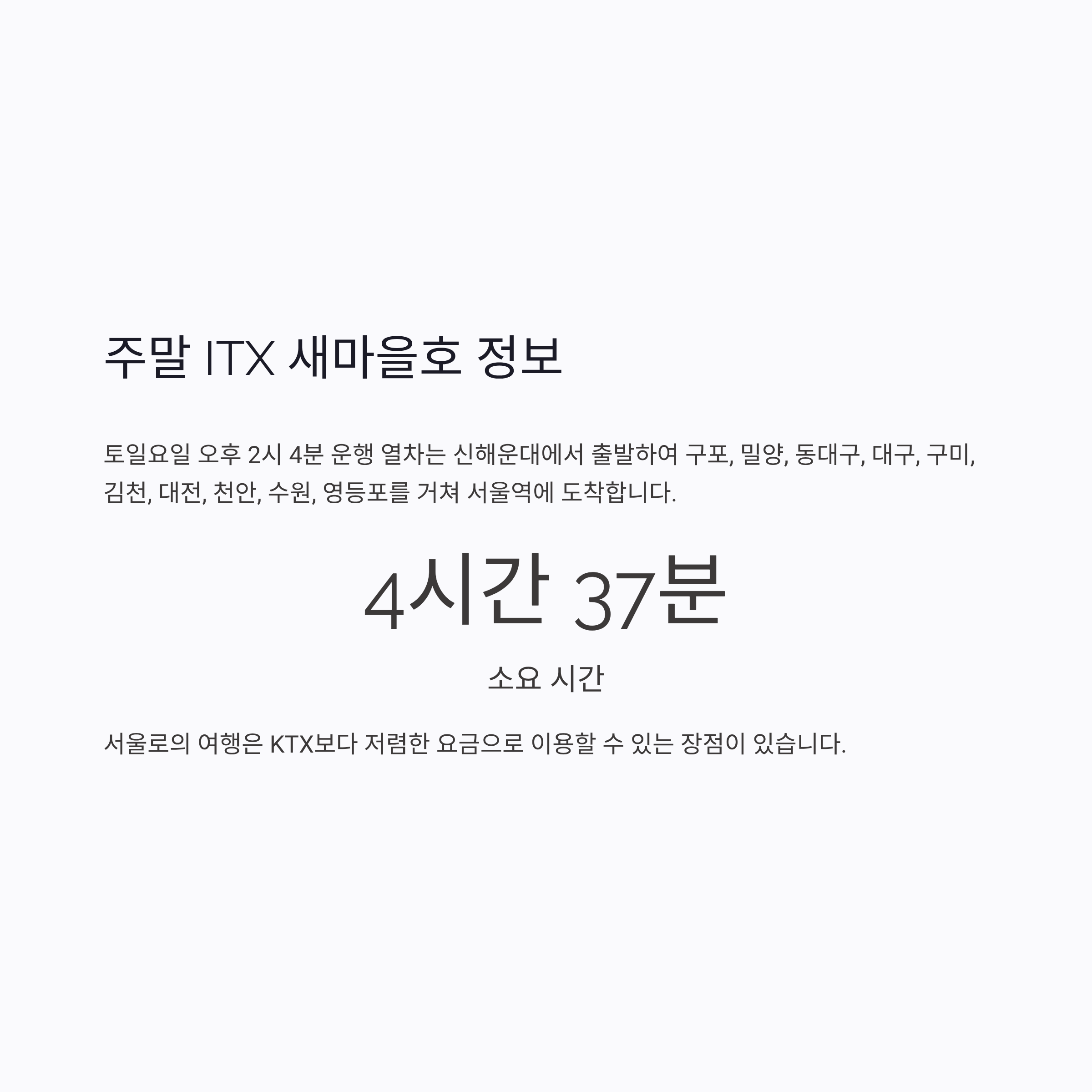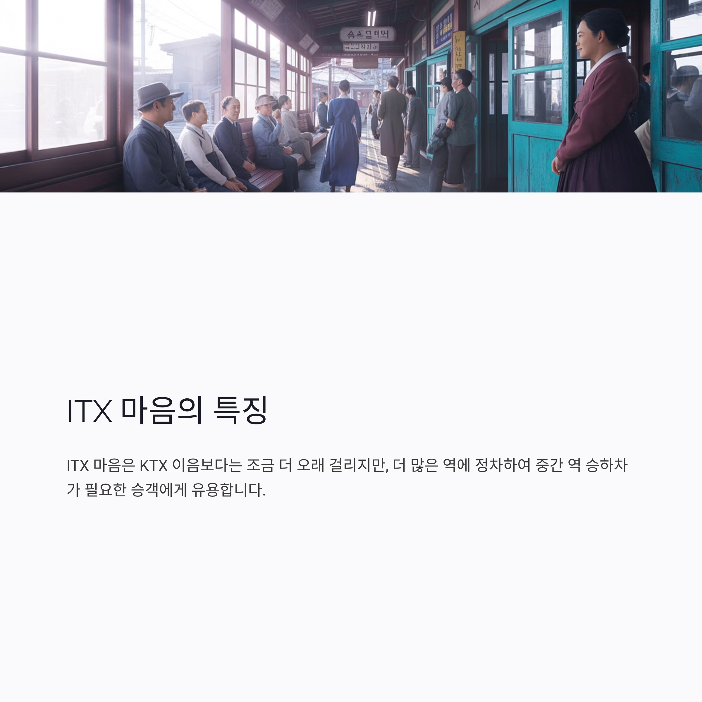 ITX 마음은 KTX 이음보다는 조금 더 오래 걸리지만, 더 많은 역에 정차하여 중간 역 승하차가 필요한 승객에게 유용합니다.