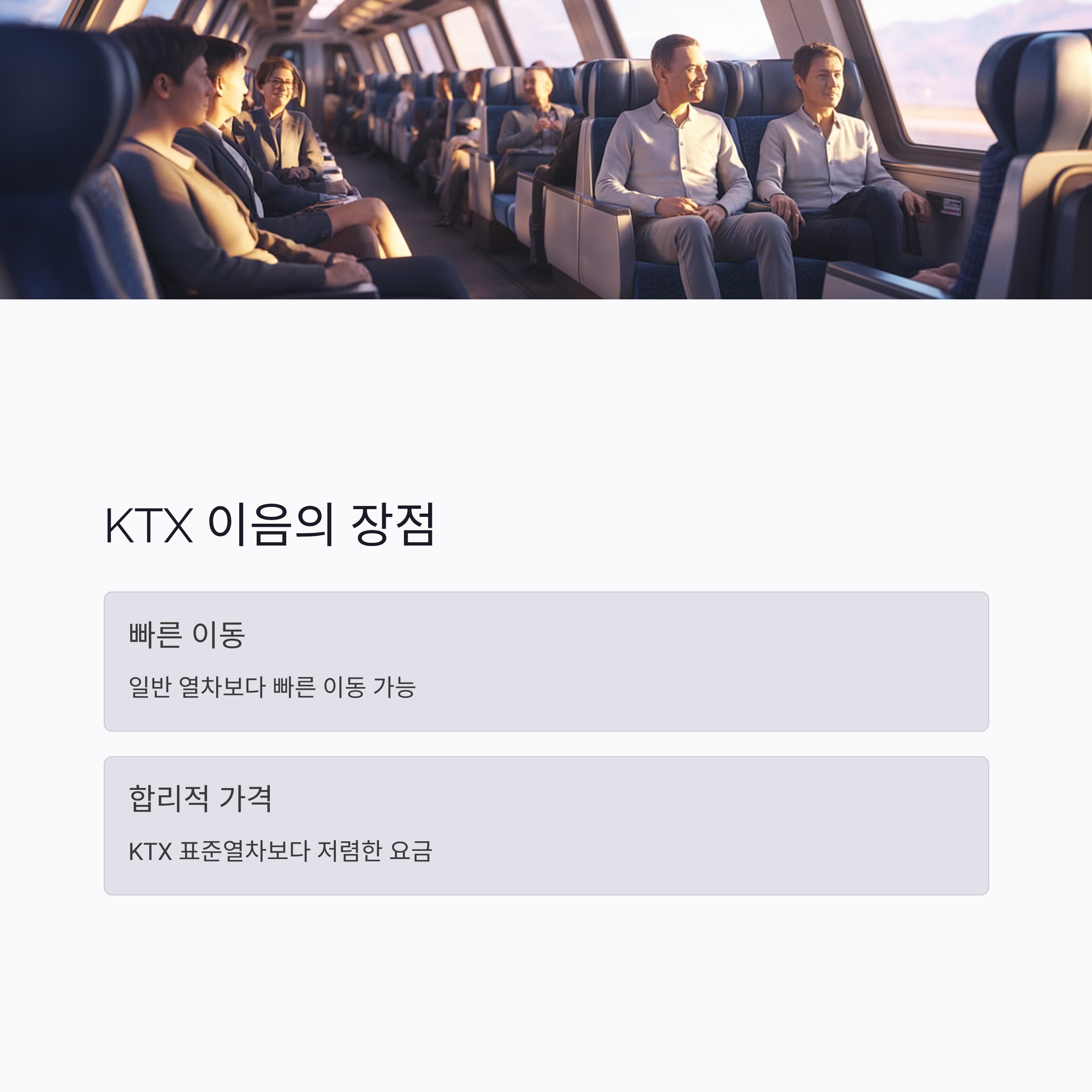 KTX 이음은 일반 열차보다 빠른 이동이 가능하면서도 KTX 표준열차보다는 저렴한 가격이 장점입니다.
