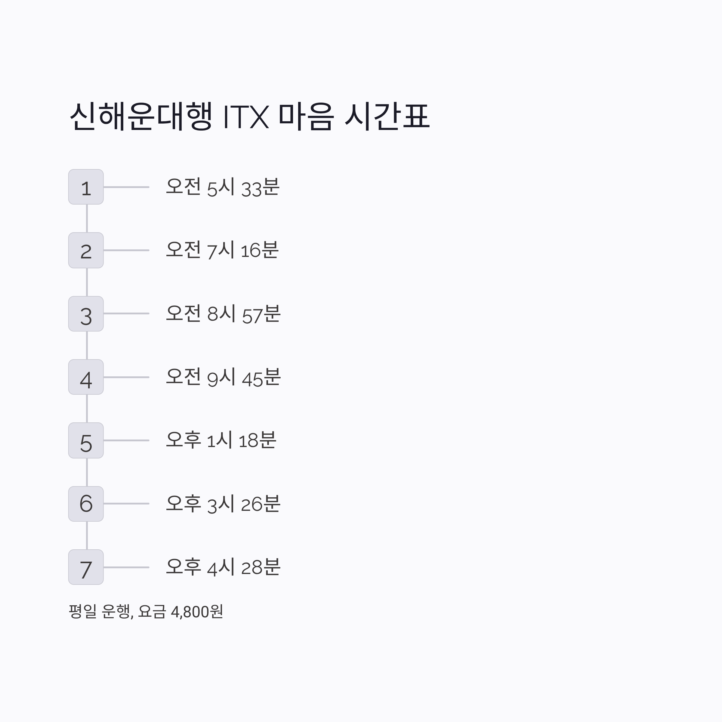 ITX 마음은 평일에 오전 5시 33분, 오전 7시 16분, 오전 8시 57분, 오전 9시 45분, 오후 1시 18분, 오후 3시 26분, 오후 4시 28분에 운행되며, 요금은 4,800원입니다.