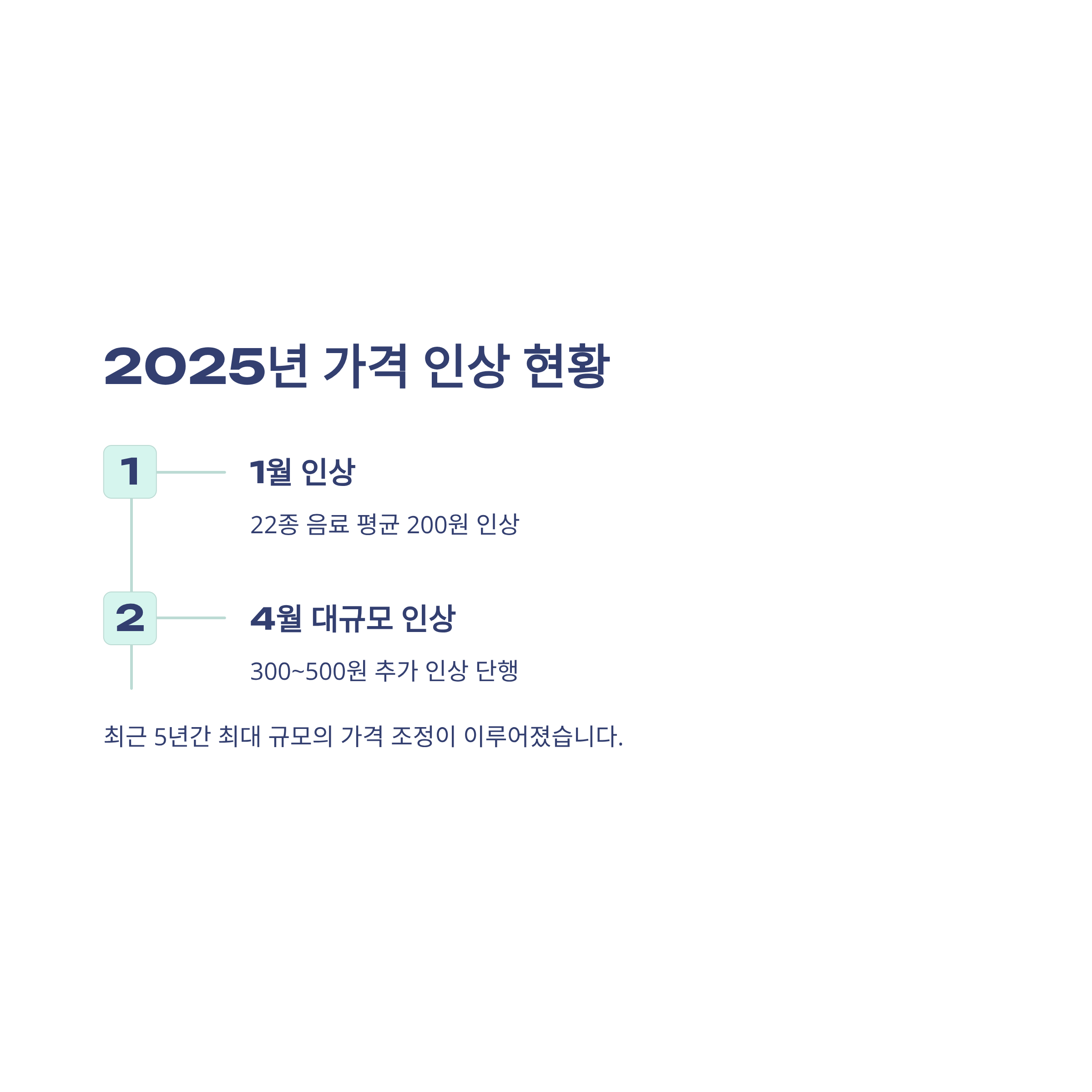 연초 1월에 22종의 음료 가격을 평균 200원 인상했으며, 4월에는 추가로 300~500원의 대규모 인상을 단행했습니다.
