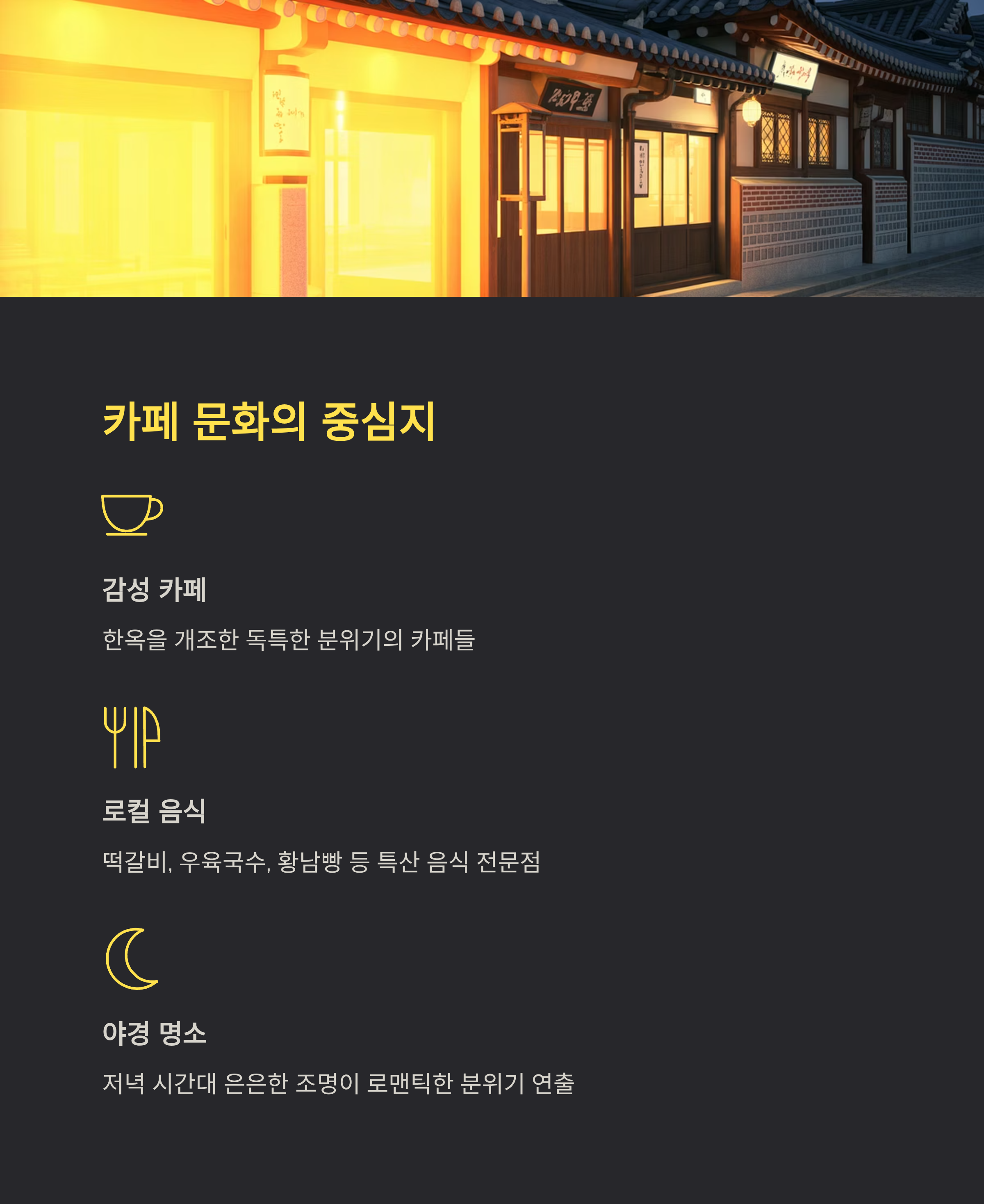 전통 한옥을 개조한 카페, 식당, 숍들이 밀집해 있으며, 젊은 세대뿐만 아니라 중장년층 여행객들도 즐겨 찾습니다.