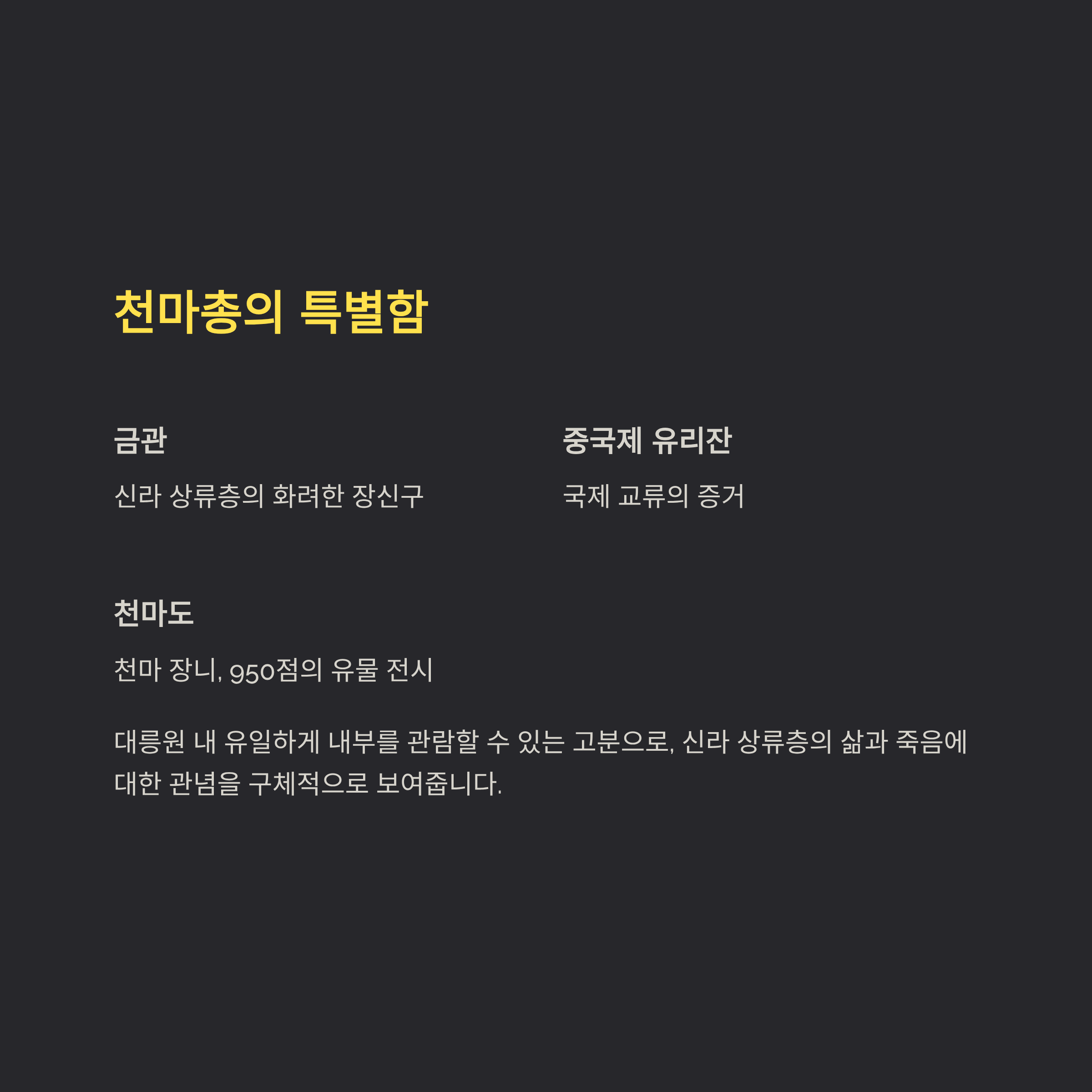 내부에는 목관(나무 관)이 그대로 복원되어 있으며, 관 주변에서 출토된 금관, 금귀고리, 중국제 유리잔, 그리고 천마도(천마 장니) 등 950점의 유물이 전시됩니다.