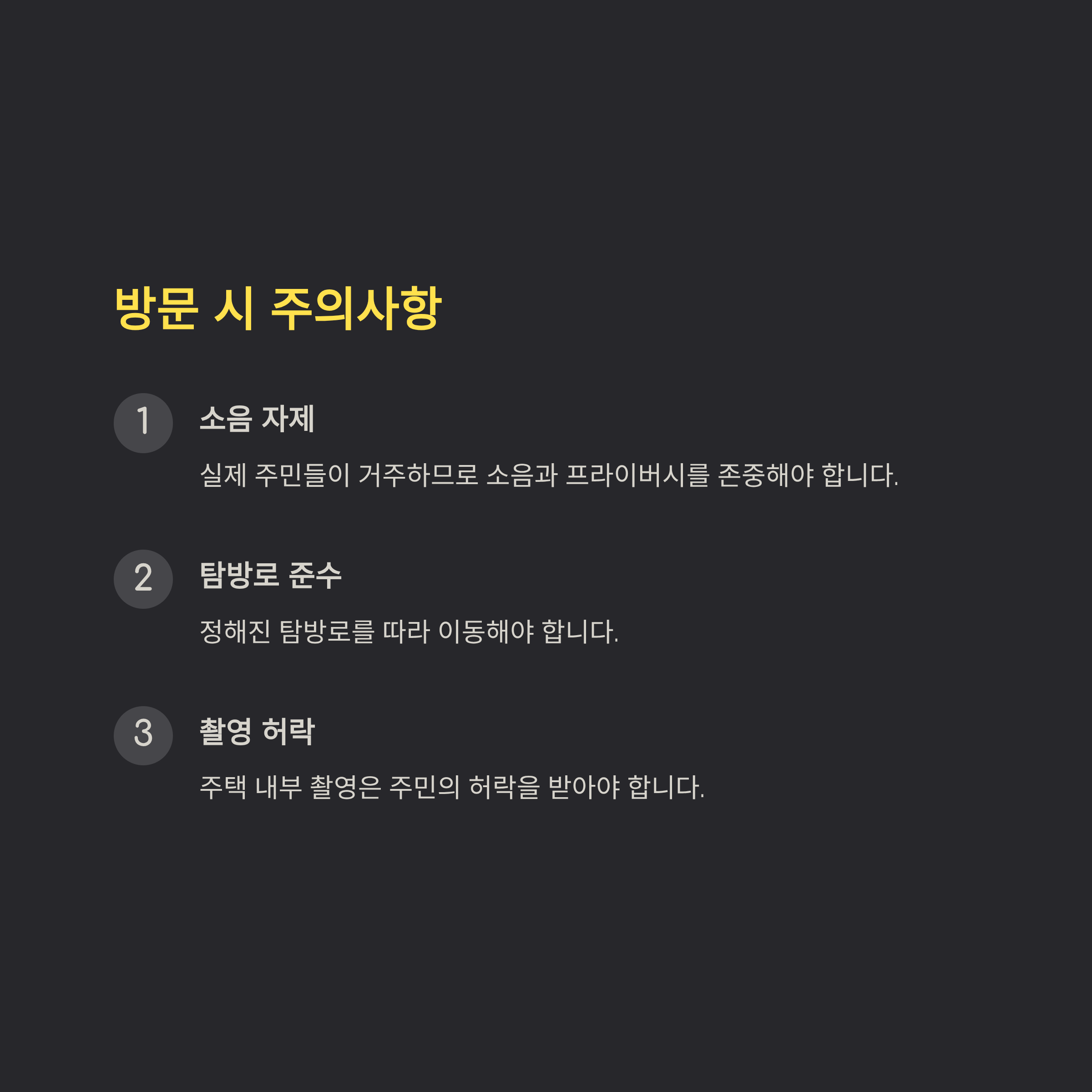 마을 내 실제 주민들이 거주하고 있으므로, 방문 시 소음과 프라이버시를 존중해야 합니다.