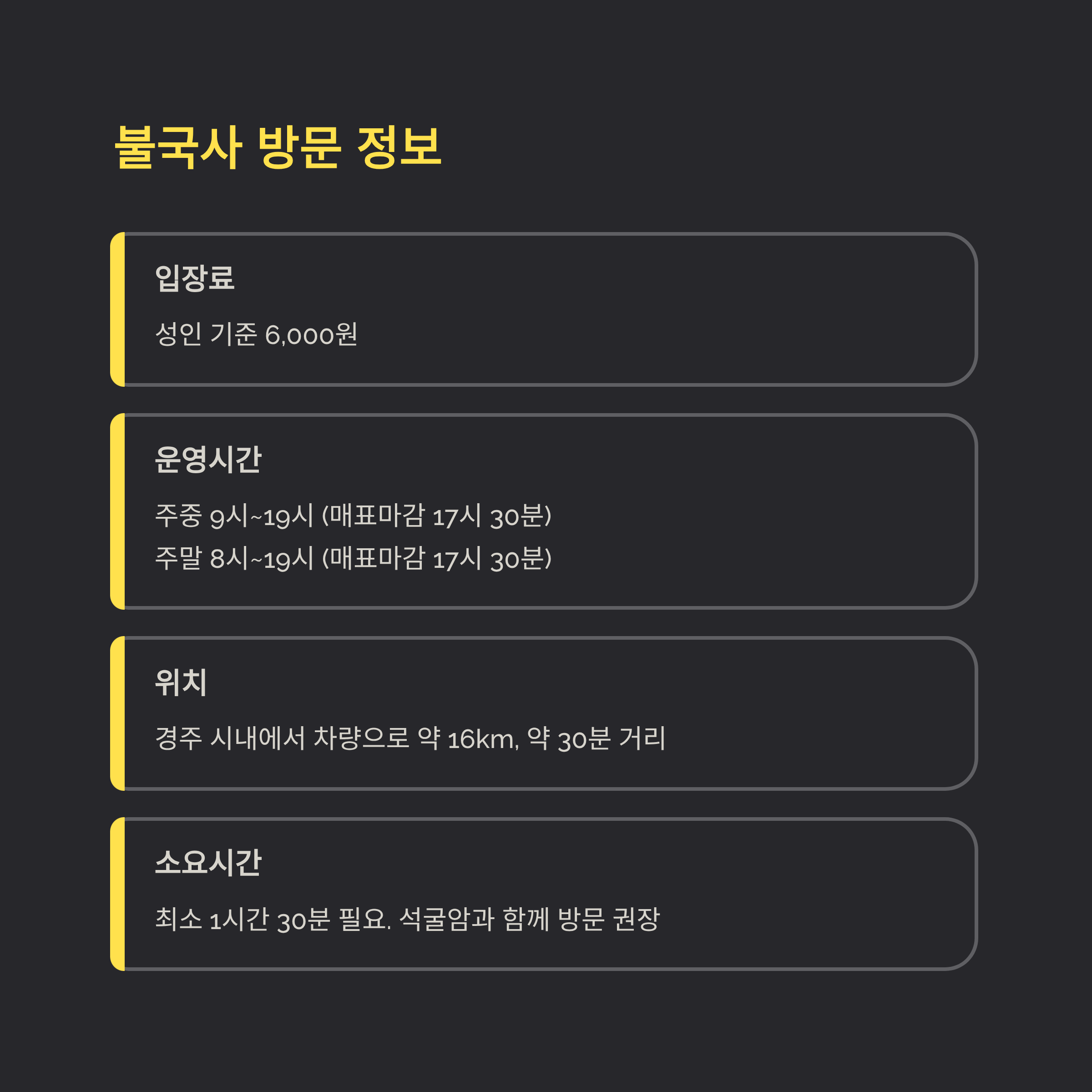 불국사 입장료는 성인 기준 6,000원이며, 주중 9시~19시(매표마감 17시 30분), 주말 8시~19시(매표마감 17시 30분) 운영됩니다.
