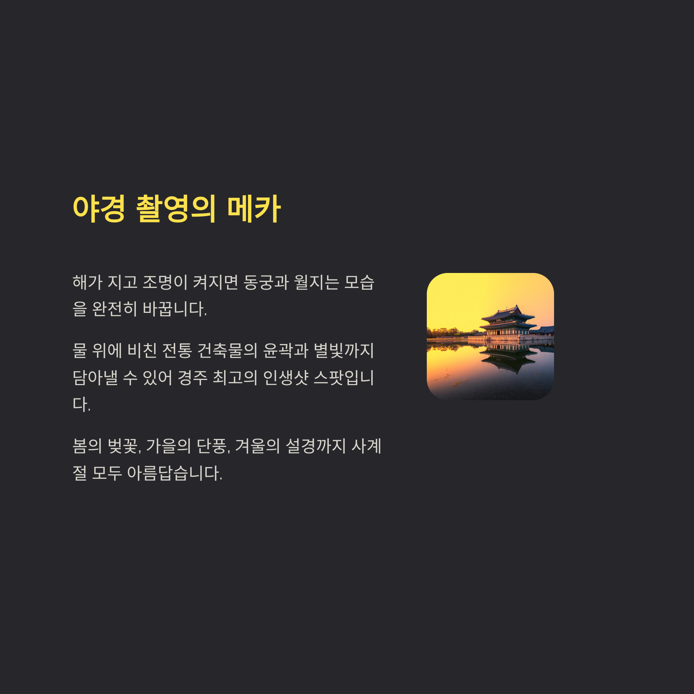 물 위에 비친 전통 건축물의 윤곽, 그리고 그 위의 별빛까지 담아낼 수 있어, 경주의 야경 명소 중 최고의 인생샷 스팟입니다.