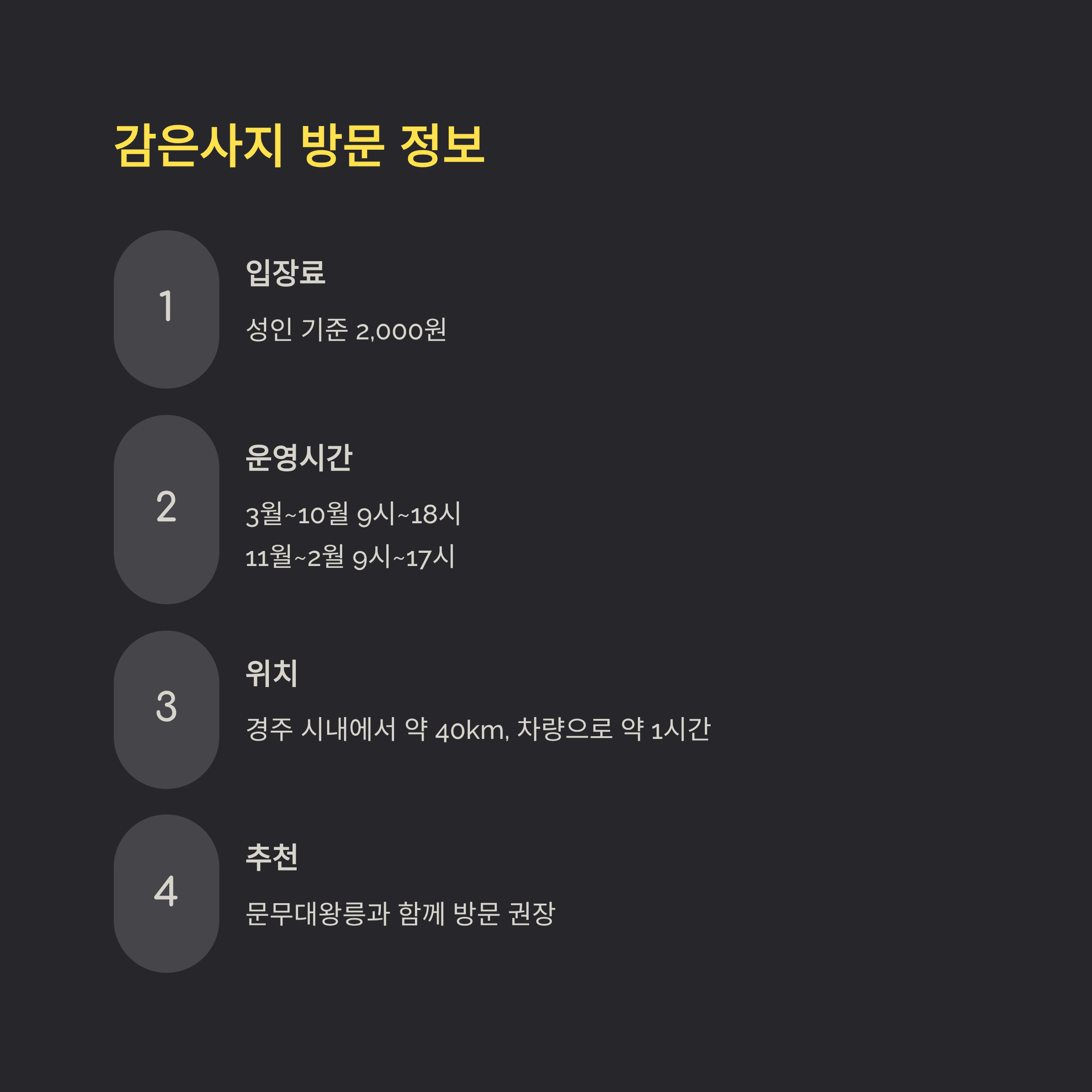 경주 시내에서 약 30km 떨어져 있어 차량 이동이 필수입니다.