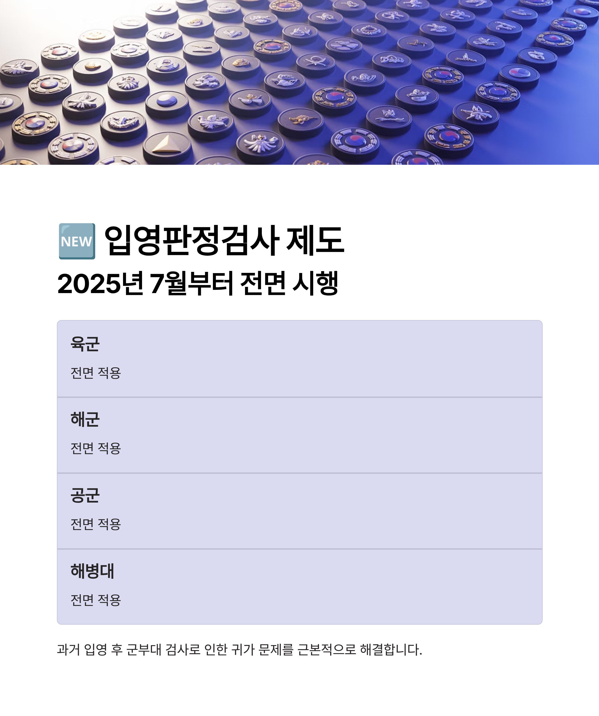 2025년 7월부터 육군, 해군, 공군, 해병대 모두에게 입영판정검사가 전면 적용됩니다.
