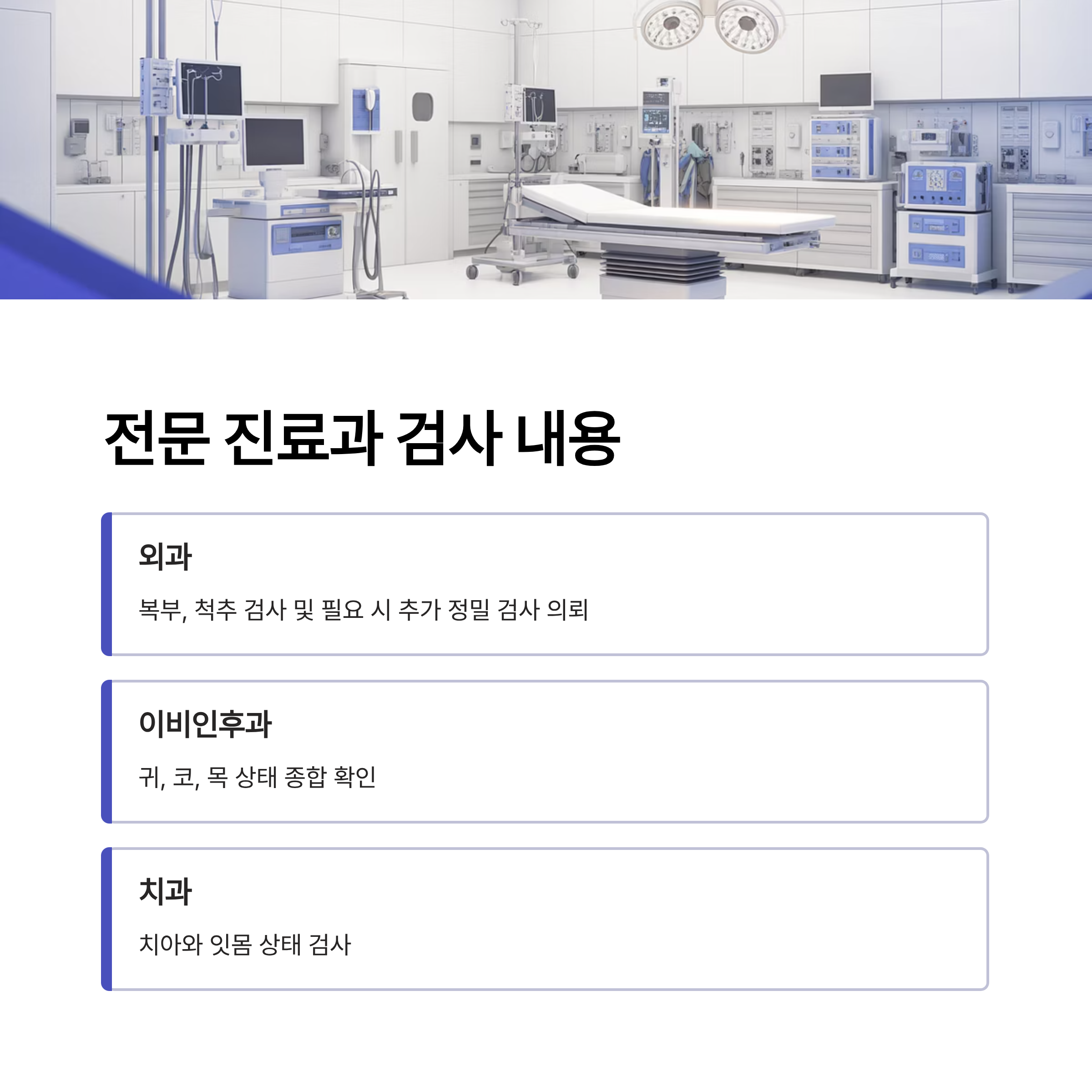 정신건강의학과 검사에서는 정신 질환 여부를 확인하고, 내과에서는 심장, 폐, 소화기 등 내부 장기를 검사합니다.