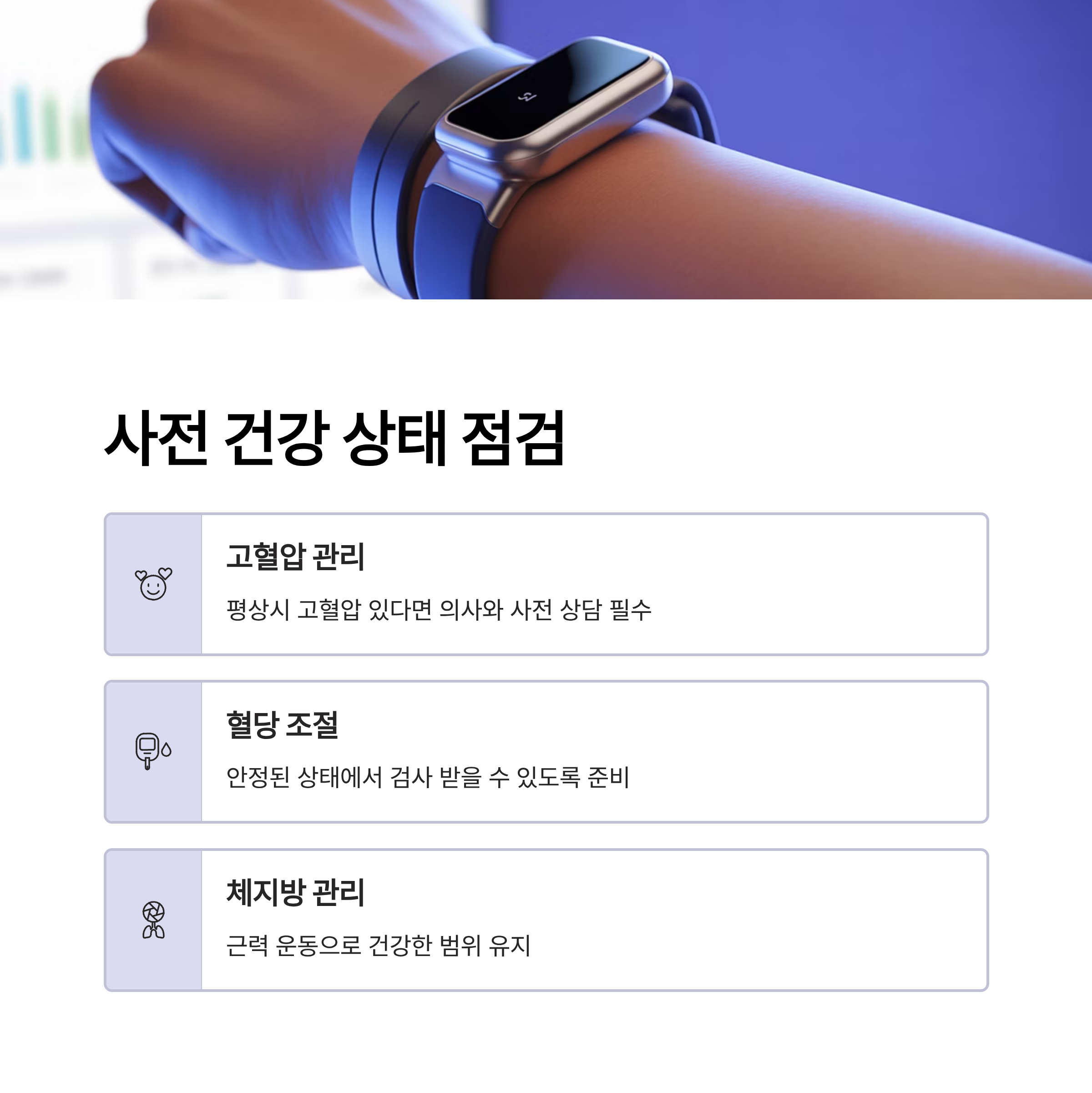 평상시 고혈압이나 혈당 문제가 있다면 미리 의사와 상담해 안정된 상태에서 검사를 받을 수 있도록 준비합니다.