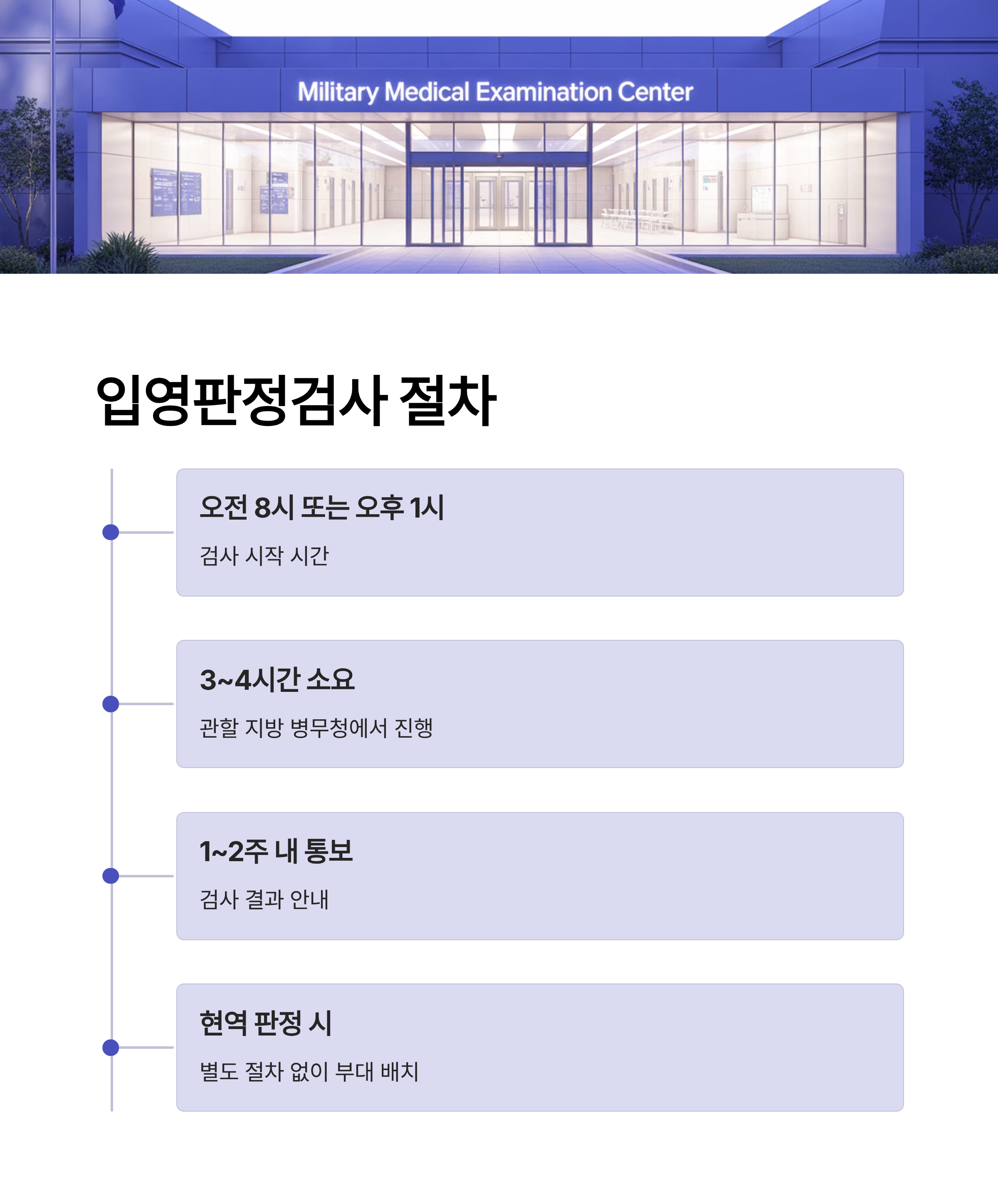 입영판정검사는 오전 8시 또는 오후 1시에 시작되며, 약 3~4시간이 소요됩니다.